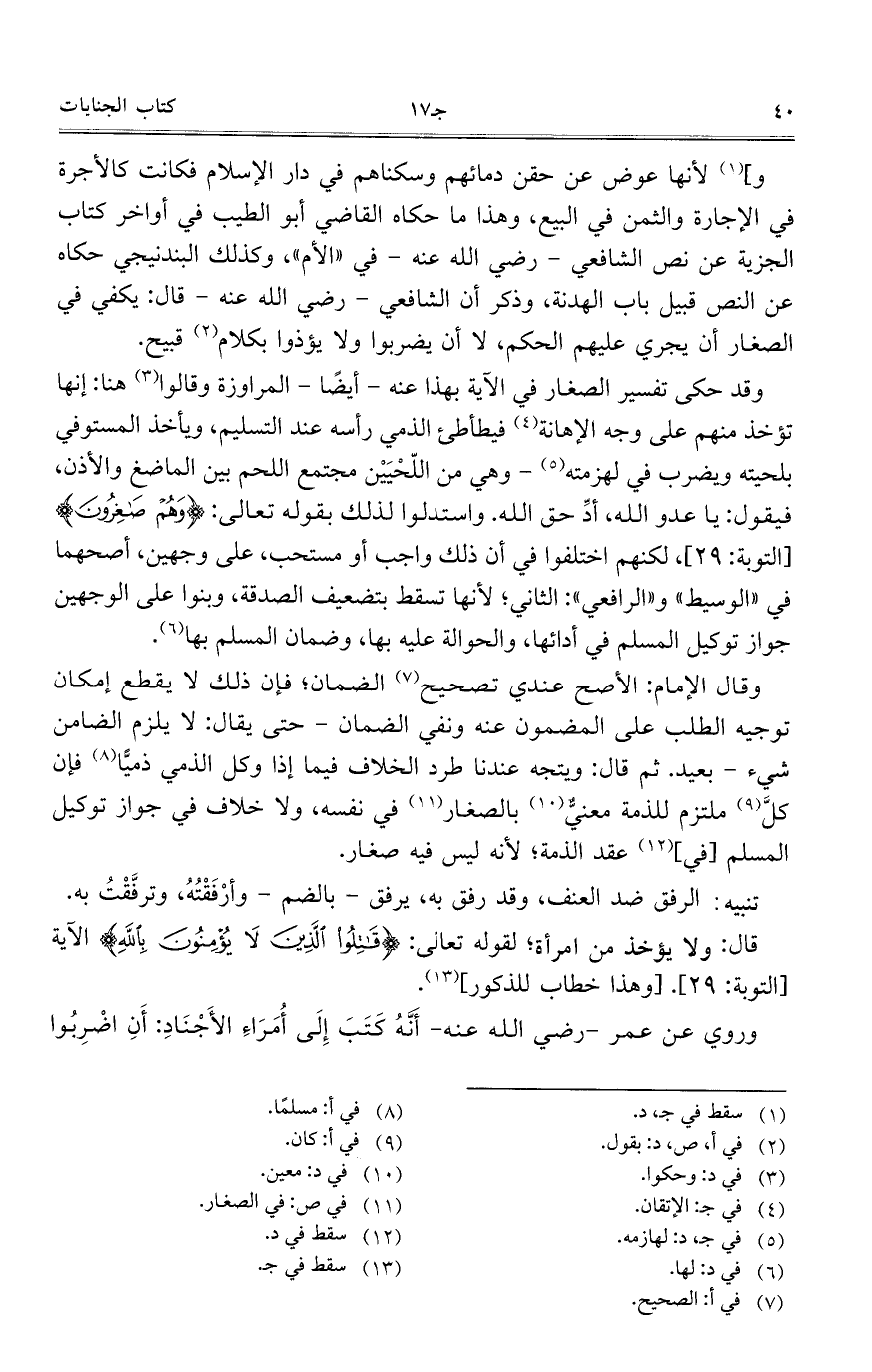 وقد حكى تفسير الصغار في الآية بهذا عنه – أيضا – المراوزة وقالوا هنا: إنها تؤخذ منهم على وجه الإهانة فيطأطئ الذمي رأسه عند التسليم، ويأخذ المستوفي بلحيته ويضرب في لهزمته – وهي من اللحيين مجتمع اللحم بين الماضغ والأذن، فيقول: يا عدو الله، أد حق الله. واستدلوا لذلك بقوله تعالى: {وهم صاغرون} [التوبة: 29]، لكنهم اختلفوا في أن ذلك واجب أو مستحب، على وجهين، أصحهما في "الوسيط" و"الرافعي": الثاني؛ لأنها تسقط بتضعيف الصدقة، وبنوا على الوجهين جواز توكيل المسلم في أدائها، والحولة عليه بها، وضمان المسلم بها.