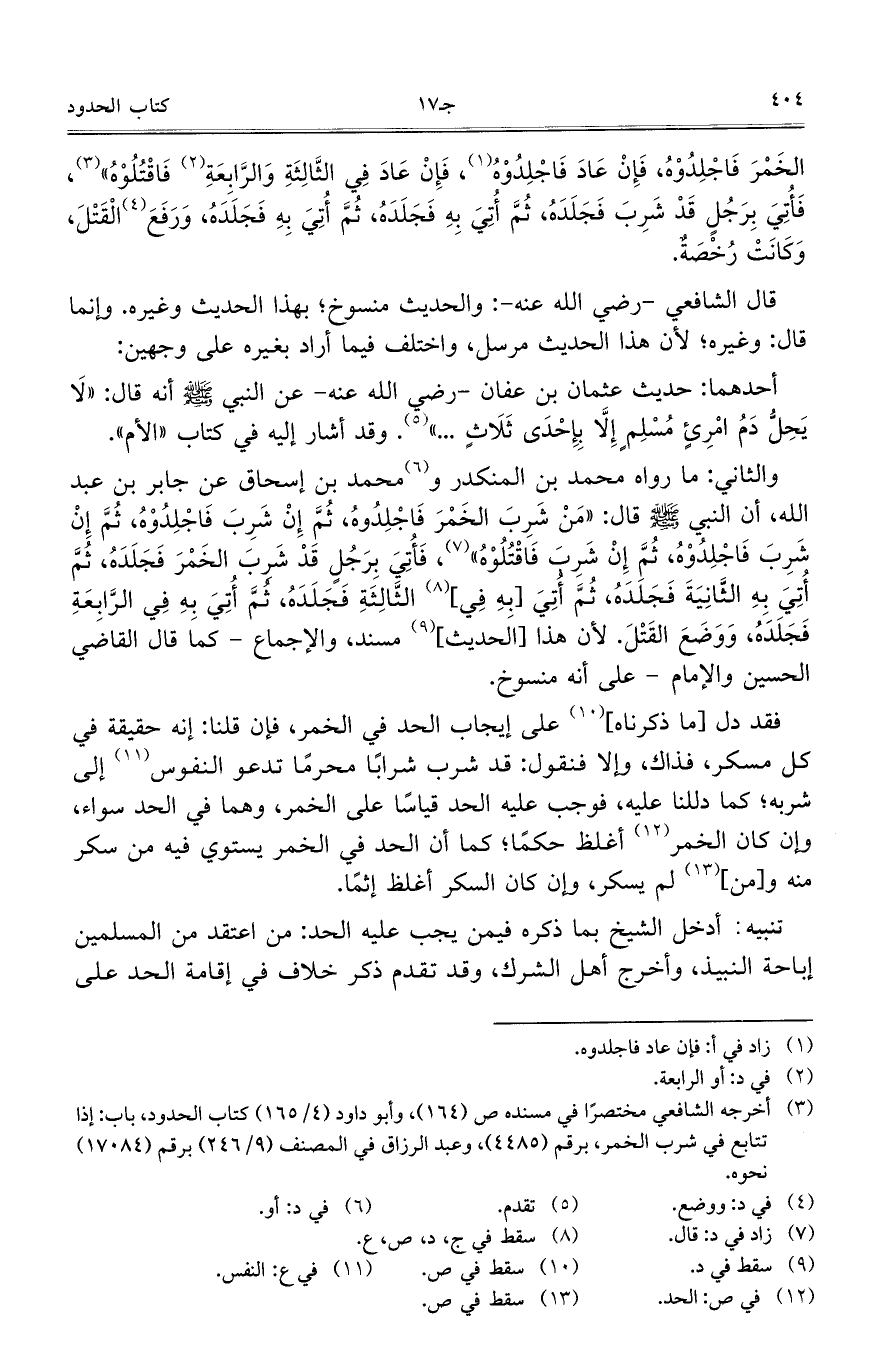 والثاني: ما رواه محمد بن المنكدر ومحمد ابن اسحاق عن جابر بن عبد الله، أن النبي صلى الله عليه وسلم قال: "من شرب الخمر فاجلدوه، ثم إن شرب فاجلدوه، ثم إن شرب فاجلدوه، ثم إن شرب فاقتلوه"، فأتي برجل قد شرب الخمر فجلده، ثم أتي [به في] الثانية فجلده، ثم أتي [به في] الثالثة فجلده، ثم أتي به في الرابعة فجلده، ووضع القتل. لأن هذا [الحديث] مسند، والإجماع –كما قال القاضي الحسين والإمام- على أنه منسوخ.