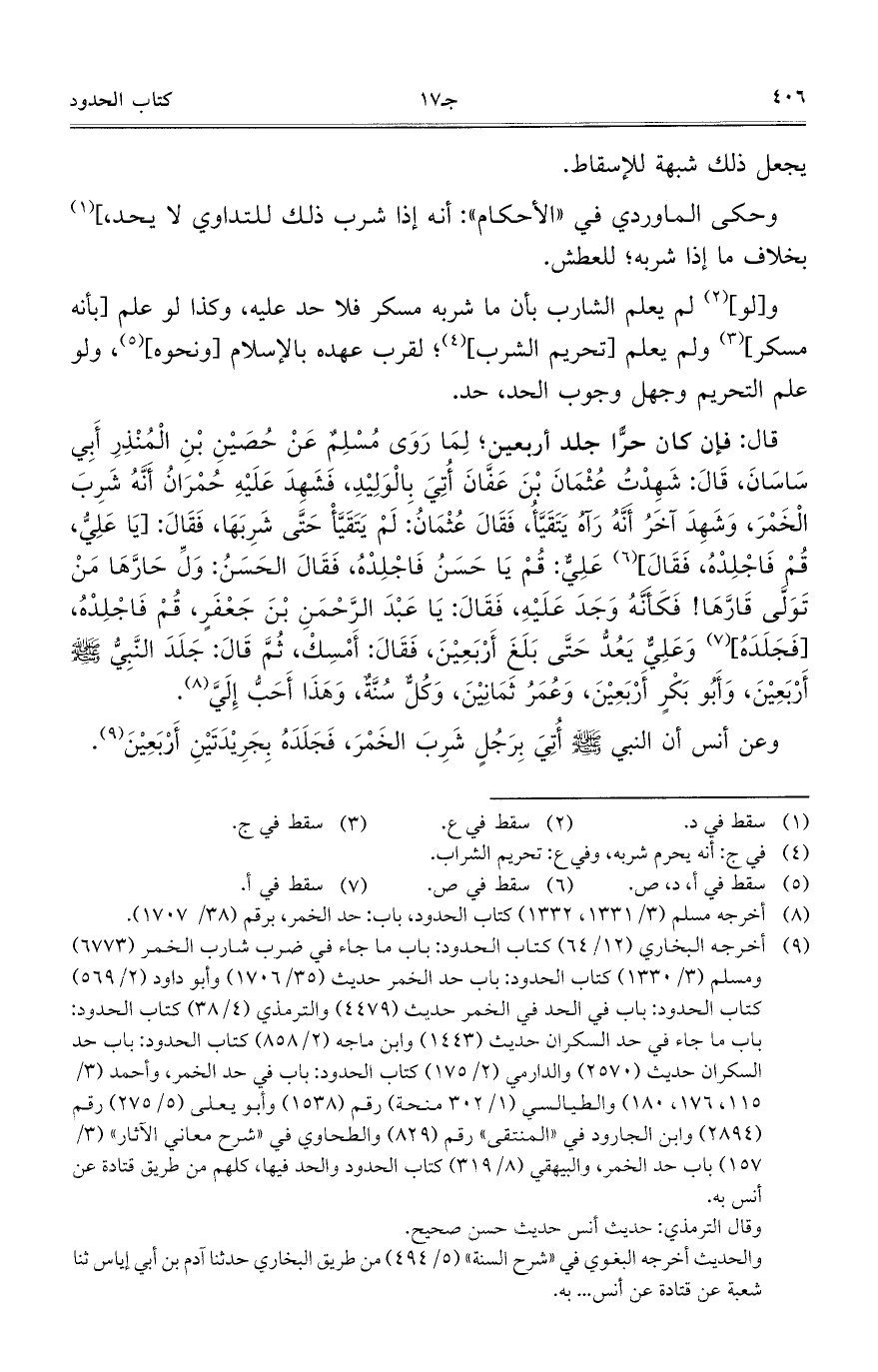 قال: فإن كان حرا جلد أربعين؛ لما روى مسلم عن حصين بن المنذر أبي ساسان، قال: شهدت عثمان بن عفان أتى بالوليد، فشهد عليه حمران أنه شرب الخمر، وشهد آخر أنه رآه يتقيأ، فقال عثمان: لم يتقيأ حتى شربها، فقال: [يا علي، قم فاجلده، فقال] علي: قم يا حسن فاجلده، فقال الحسن: ول حارها من تولى قارها! فكأنه وجد عليه، فقال: يا عبد الرحمن بن جعفر، قم فاجلده، [فجلده] وعلي يعد حتى بلغ أربعين، فقال: أمسك، ثم قال: جلد النبي أربعين، وأبو بكر أربعين، وعمر ثمانين، وكل سنة، وهذا أحب إلي.