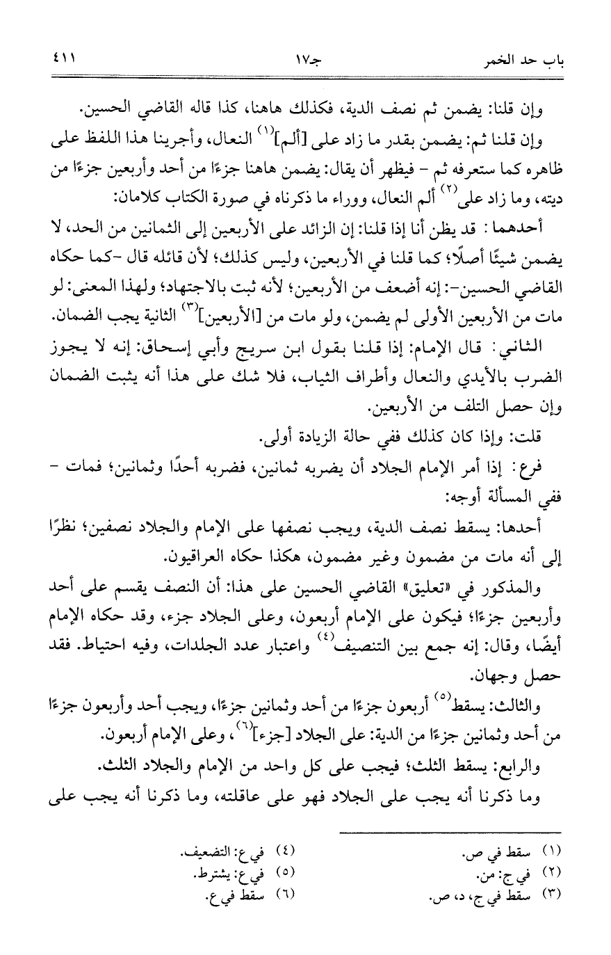 والثالث: يسقط أربعون جزءا من أحد وثمانين جزءا، ويجب أحد وأربعين جزءا من أحد وثمانين جزءا من الدية: على الجلاد [جزء] وعلى الإمام أربعون.
