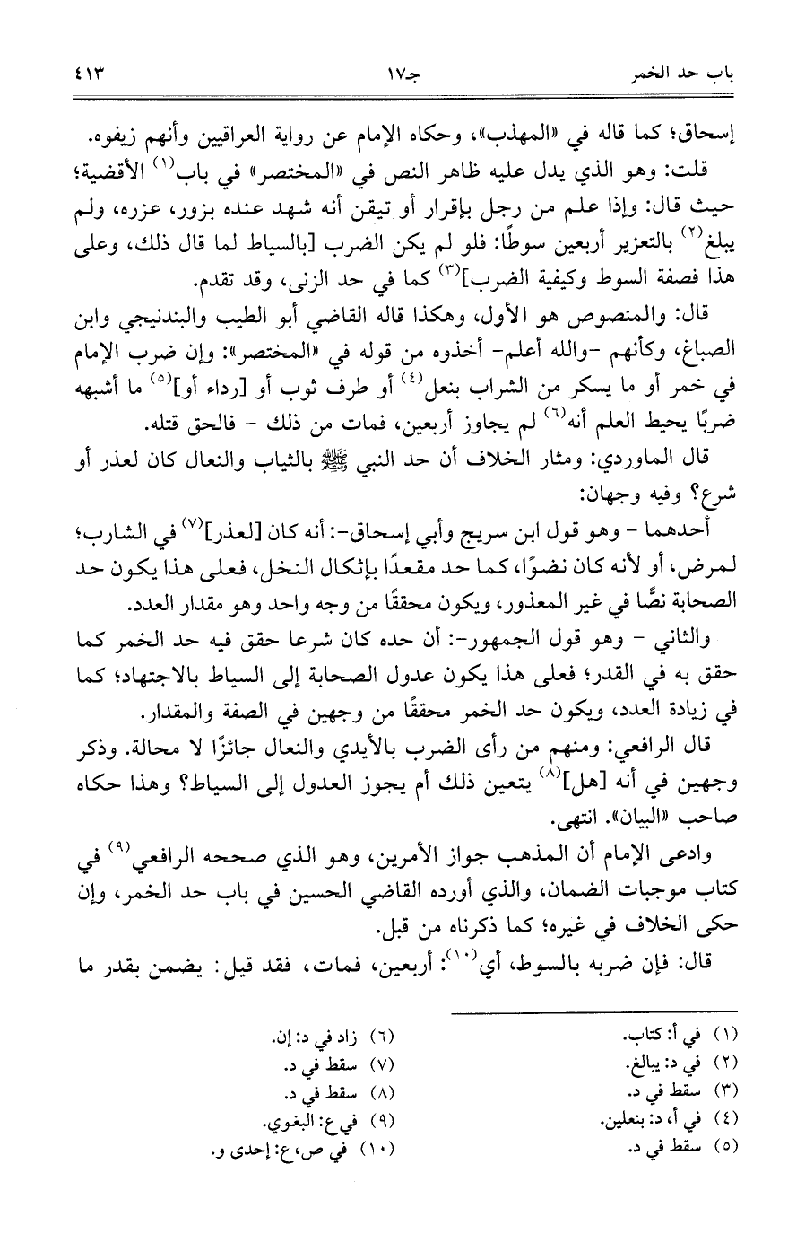 قال الرافعي: ومنهم من رأى الضرب بالأيدي والنعال جائزا لا محالة. وذكر وجهين في أنه [هل] يتعين ذلك أم يجوز العدول إلى السياط؟ وهذا حكاه صاحب "البيان". انتهى.