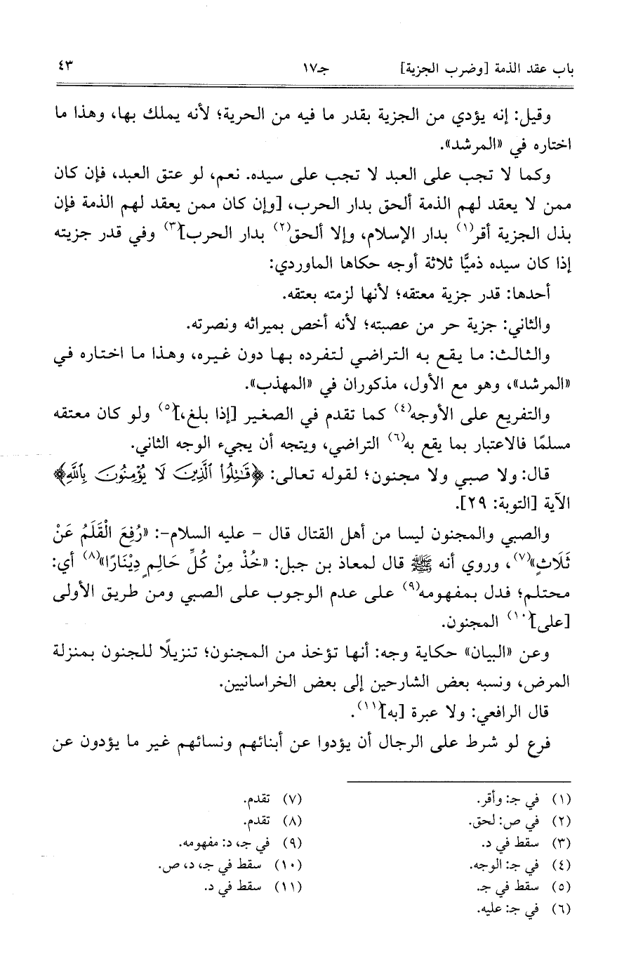 والصبي والمجنون ليسا من أهل القتال قال – عليه السلام –: "رفع القلم عن ثلاث"، وروي أنه صلى الله عليه وسلم قال لمعاذ بن جبل: "خذ من كل حالم دينارا" أي: محتلم؛ فدل بمفهومه على عدم الوجوب على الصبي ومن طريق الأولى [على] المجنون.