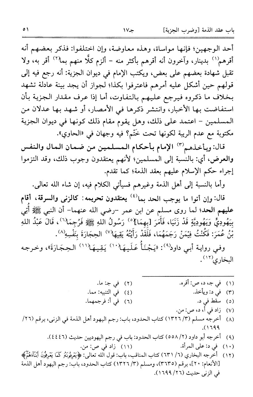 قال: وإن أتوا ما يوجب الحد بما يعتقدون تحريمه: كالزنى والسرقة، أقام عليهم الحد؛ لما روى مسلم عن ابن عمر – رضي الله عنهما – أن النبي صلى الله عليه وسلم أتي بيهودي ويهودية قد زنيا، فأمر [بهما] رسول الله صلى الله عليه وسلم فرجما، قال عبد الله بن عمر: فكنت فيمن رجمهما، فلقد رأيته يقيها الحجارة بنفسه.