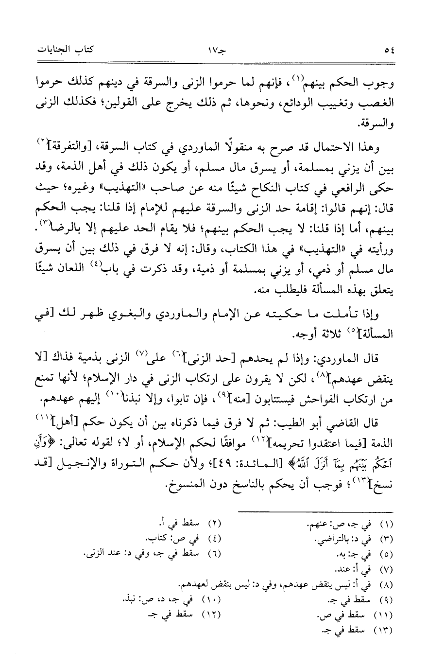 وهذا الاحتمال قد صرح به منقولا الماوردي في كتاب السرقة، [والتفرقة] بين أن يزني بمسلمة، أو يسرق مال مسلم، أو يكون ذلك في أهل الذمة، وقد حكى الرافعي في كتاب النكاح شيئا منه عن صاحب "التهذيب" وغيره؛ حيث قال: إنهم قالوا: إقامة حد الزنى والسرقة عليهم للإمام إذا قلنا: يجب الحكم بينهم، أما إذا قلنا: لا يجب الحكم بينهم؛ فلا يقام الحد عليهم إلا بالرضا.