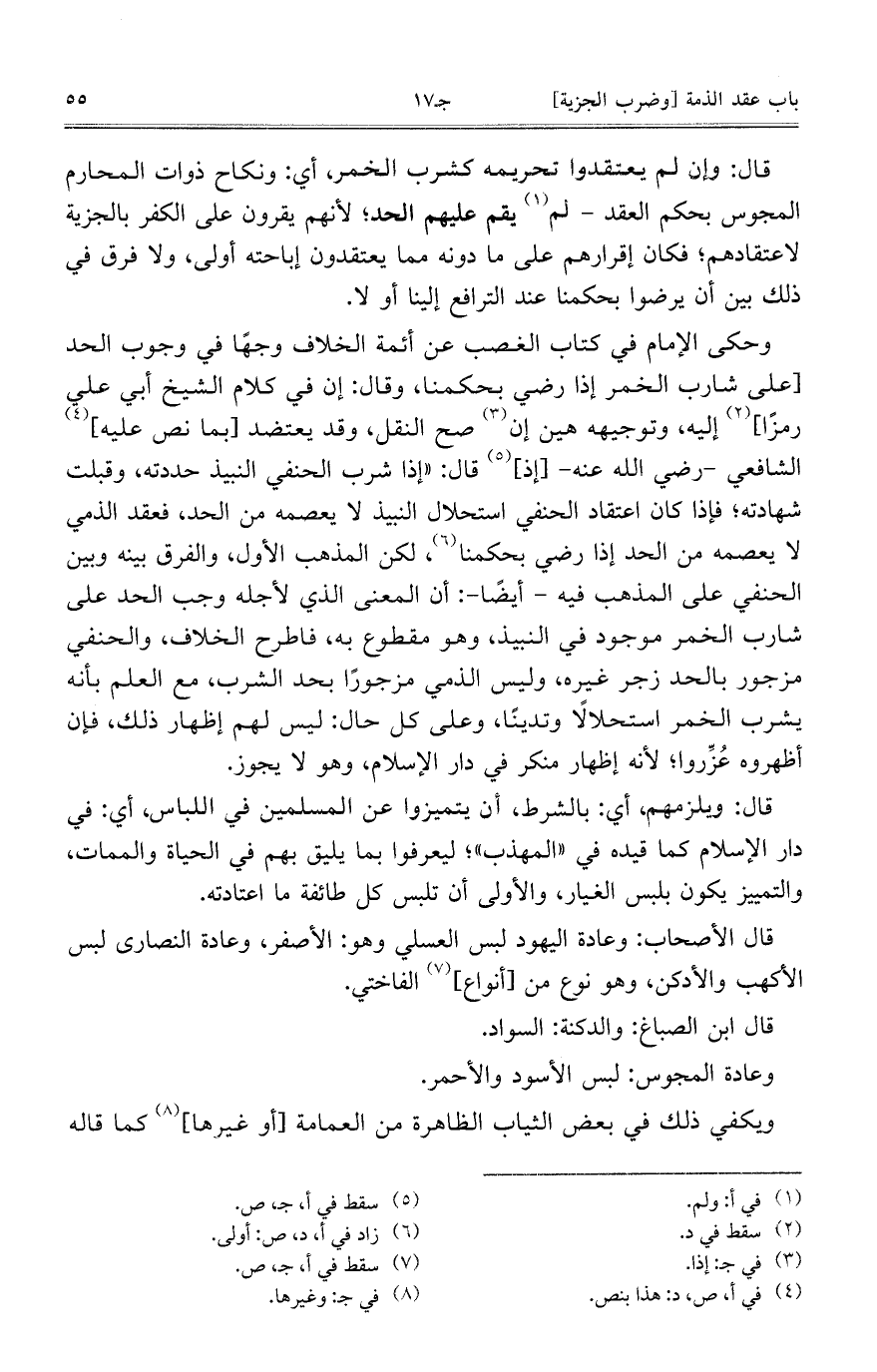 قال: وإن لم يعتقدوا تحريمه كشرب الخمر، أي: ونكاح ذوات المحارم المجوس بحكم العقد – لم يقم عليهم الحد؛ لأنهم يقرون على الكفر بالجزية لاعتقادهم؛ فكان إقرارهم على ما دونه مما يعتقدون إباحته أولى، ولا فرق في ذلك بين أن يرضوا بحكمنا عند الترافع إلينا أو لا.