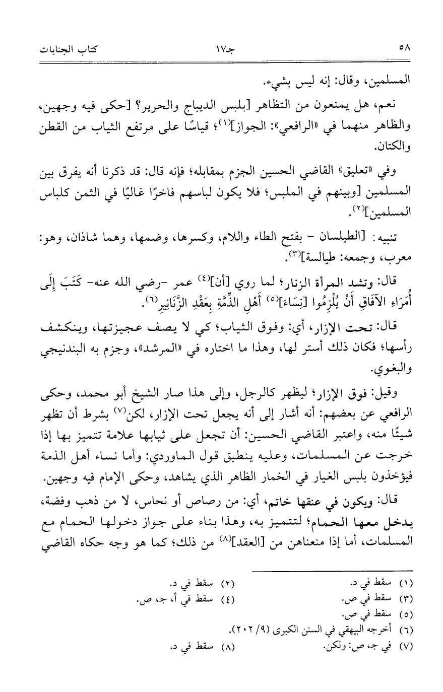 وفي "تعليق" القاضي الحسين الجزم بمقابله؛ فإنه قال: قد ذكرنا أنه يفرق بين المسلمين [وبينهم في الملبس؛ فلا يكون لباسهم فاخرا غاليا في الثمن كلباس المسلمين].