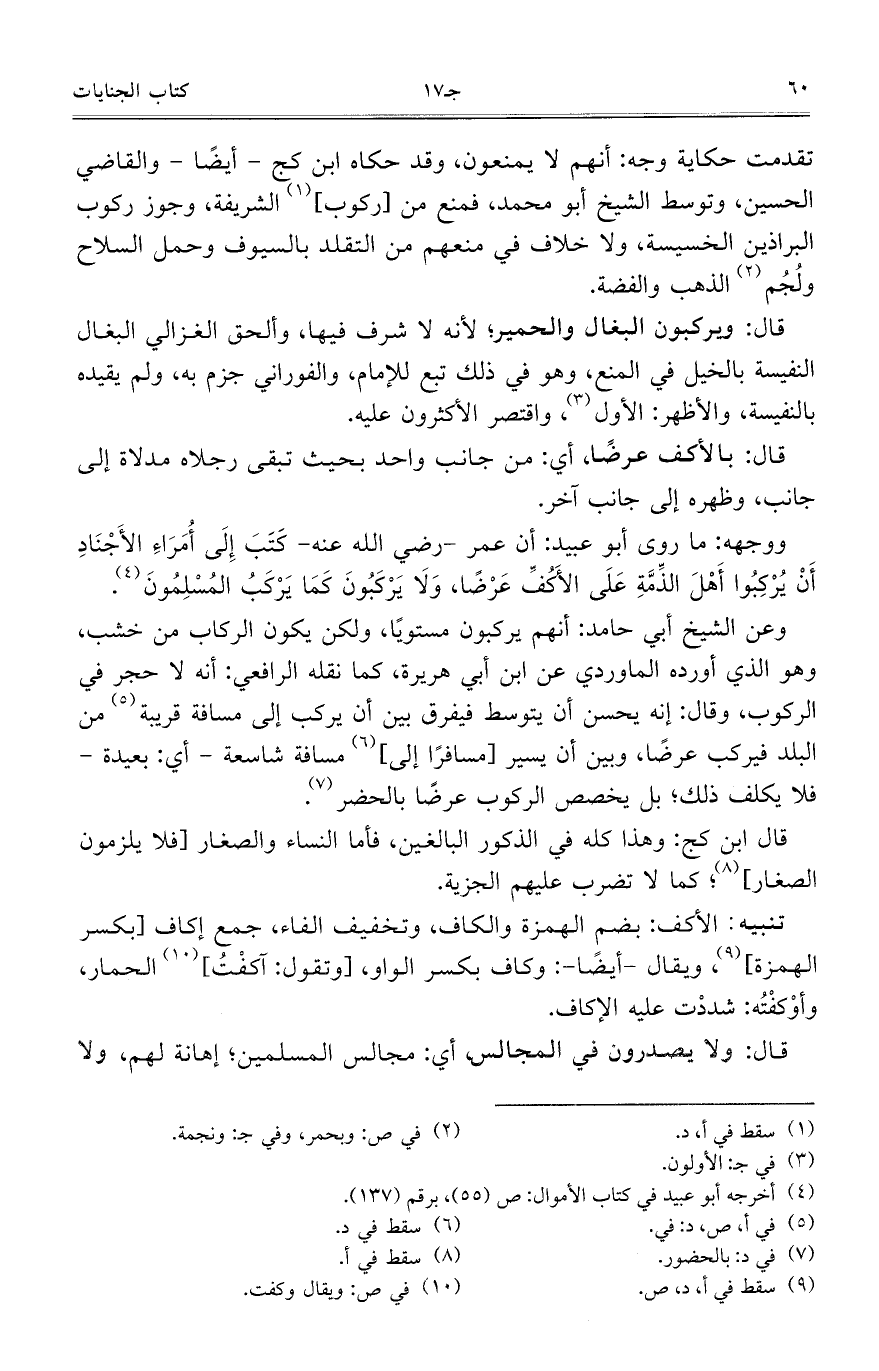 ووجهة: ما روي أبو عبيد: أن عمر – رضي الله عنه – كتب إلى أمراء الأجناد أن يركبوا أهل الذمة على الأكف عرضا – ولا يركبون كما يركب المسلمون.