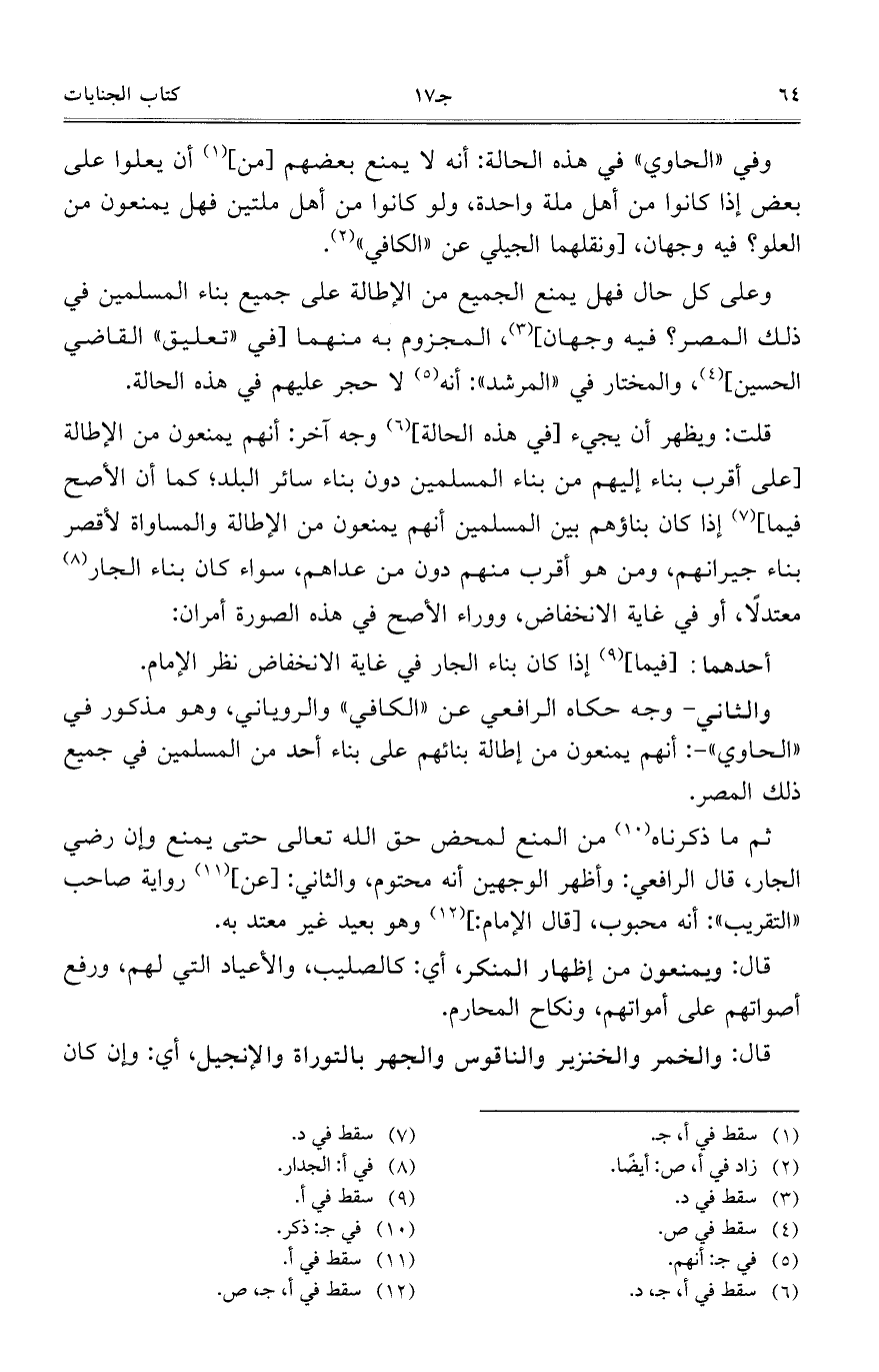قلت: ويظهر أن يجيء [في هذه الحالة] وجه آخر: أنهم يمنعون من الإطالة [على أقرب بناء إليهم من بناء المسلمين دون بناء سائر البلد؛ كما أن الأصح فيما] إذا كان بناؤهم بين المسلمين أن يمنعون من الإطالة والمساواة لأقصر بناء جيرانهم، ومن هو أقرب منهم دون من عداهم، سواء كان بماء الجار معتدلا، أو في غاية الانخفاض، ووراء الأصح في هذه الصورة أمران: