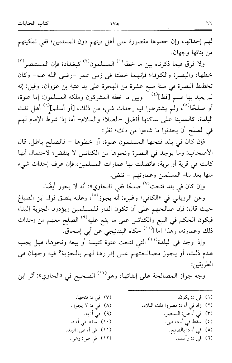 ولا فرق فيما ذكرناه بين ما خطه المسلمون كبغداد؛ فإن المستنصر خطها، والبصرة والكوفة؛ فإنهما خطتا في زمن عمر – رضي الله عنه – وكان تخطيط البصرة في سنة سبع عشرة من الهجرة على يد عتبة بن غزوان، وقيل: إنه لم يعبد بها صنم [قط]- وبين ما خطه المشركون وملكه المسلمون: إما عنوة، أو صلحا، ولم يشترطوا فيه إحداث شيء من ذلك، [أو أسلم] أهل تلك البلدة، كالمدينة على ساكنها أفضل – الصلاة والسلام – أما إذا شرط الإمام لهم في الصلح أن يحدثوا ما شاءوا من ذلك؛ نظر: