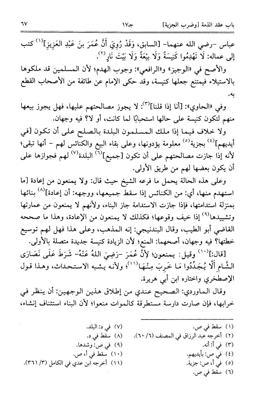 عباس – رضي الله عنهما -[السابق، وقد روي أن عمر بن عبد العزيز] كتب إلى عماله: لا تهدموا كنيسة ولا بيعة ولا بيت نار.