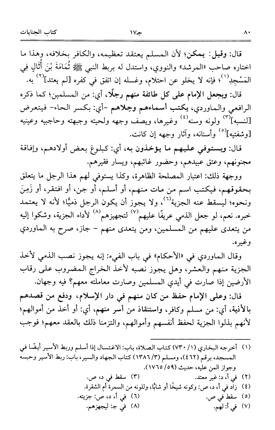 ووجهة ذلك: اعتبار المصلحة الظاهرة، وكذا يستوفي لهم هذا الرجل ما يتعلق بحقوقهم، فيكتب اسم من مات منهم، أو أسلم، أو جن، أو افتقر، أو زمن ونحوه؛ ليسقط عنه الجزية، ولا يجوز أن يكون الرجل ذميا؛ لأنه لا يعتمد خبره. نعم، لو جعل الذمي عريفا عليهم لتجهيزهم لأداء الجزية، وشكوا إليه من يتعدى عليهم من المسلمين، ومن يتعدى منهم – جاز، صرح به الماوردي وغيره.
