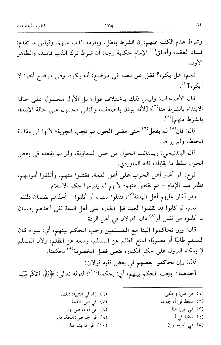 وشرط عدم الكف عنهم: إن الشرط باطل، ويلزم الذب عنهم. وقياس ما تقدم: فساد العقد، وأطلق الإمام حكاية وجه: أن شرط ترك الذب فاسد، والظاهر الأول.
