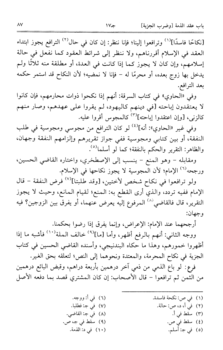 وفي غير "الحاوي": أنه] لو كان الترافع من مجوسي ومجوسية في طلب النفقة، أو بين كتابي ومجوسية ففي جواز تقريرهم وإلزامهم النفقة وجهان، والظاهر: التقرير والحكم بالنفقة؛ كما لو أسلما.