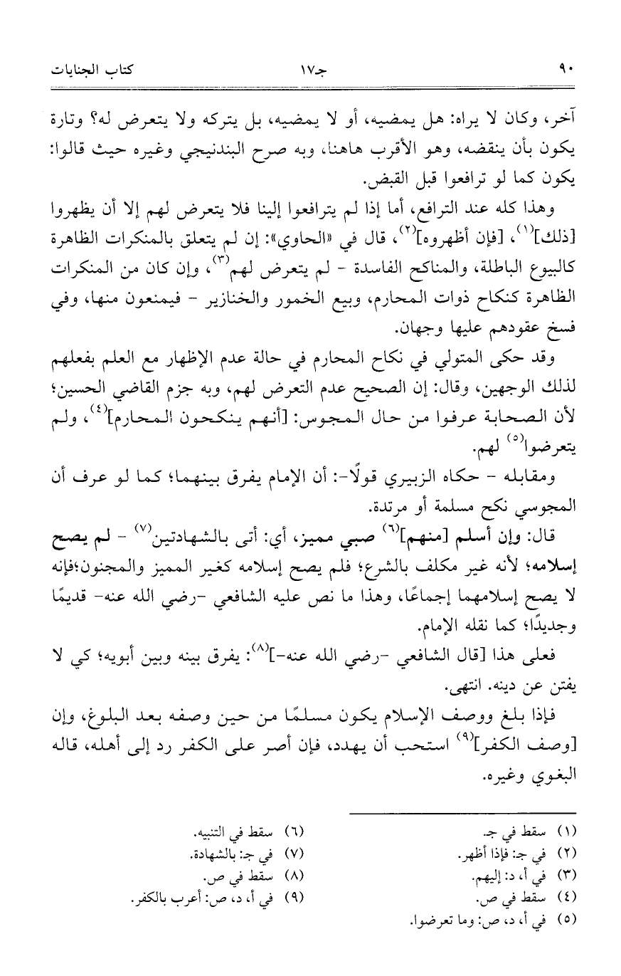 وقد حكى المتولي في نكاح المحارم في حالة عدم الإظهار مع العلم بفعلهم لذلك الوجهين، وقال: إن الصحيح عدم التعرض لهم، وبه جزم القاضي الحسين؛ لأن الصحابة عرفوا من حال المجوس: [أنهم ينكحون المحارم]، ولم يتعرضوا لهم.