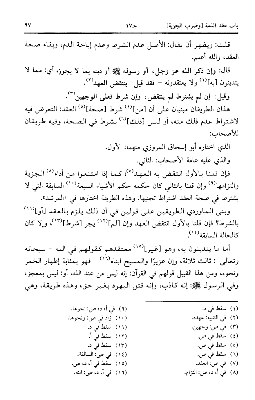 قال: وإن ذكر الله عز وجل، أو رسوله صلى الله عليه وسلم أو دينه بما لا يجوز، أي: مما لا يتدينون [به] ولا يعتقدونه – فقد قيل: ينتقض العهد.
