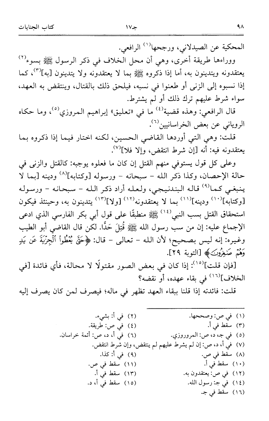 ووراءها طريقة أخرى، وهي أن محل الخلاف في ذكر الرسول صلى الله عليه وسلم بسوء يعتقدونه ويتدينون به، أما إذا ذكروه صلى الله عليه وسلم بما لا يعتقدونه ولا يتدينون [به]، كما إذا نسبوه إلى الزنى أو طعنوا في نسبه، فيلحق ذلك بالقتال، وينتقض به العهد، سواء شرط عليهم ترك ذلك أو لم يشترط.