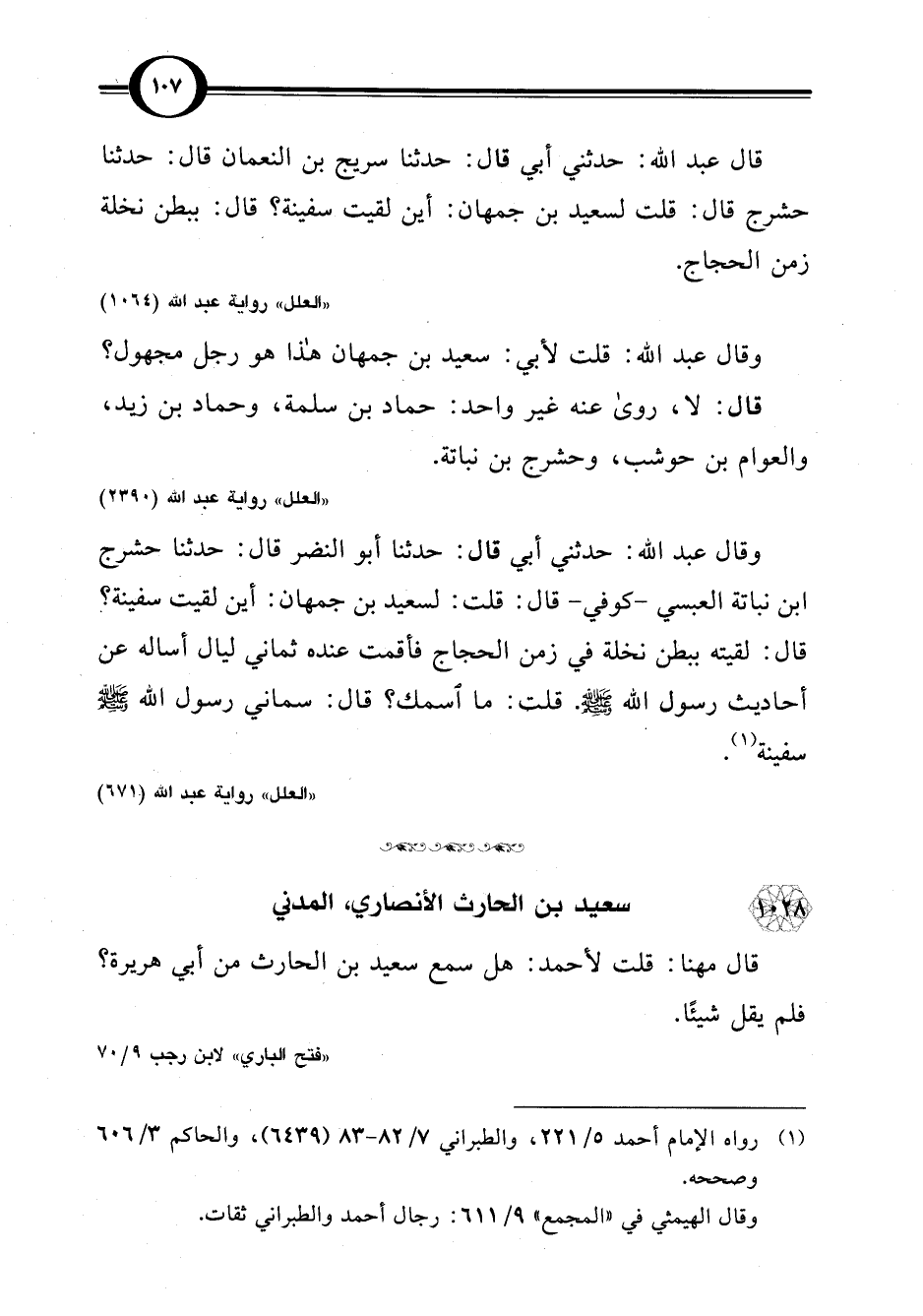 قال عبد اللَّه: حدثني أبي قال: حدثنا سريج بن النعمان قال: حدثنا حشرج قال: قلت لسعيد بن جمهان: أين لقيت سفينة؟ قال: ببطن نخلة زمن الحجاج.