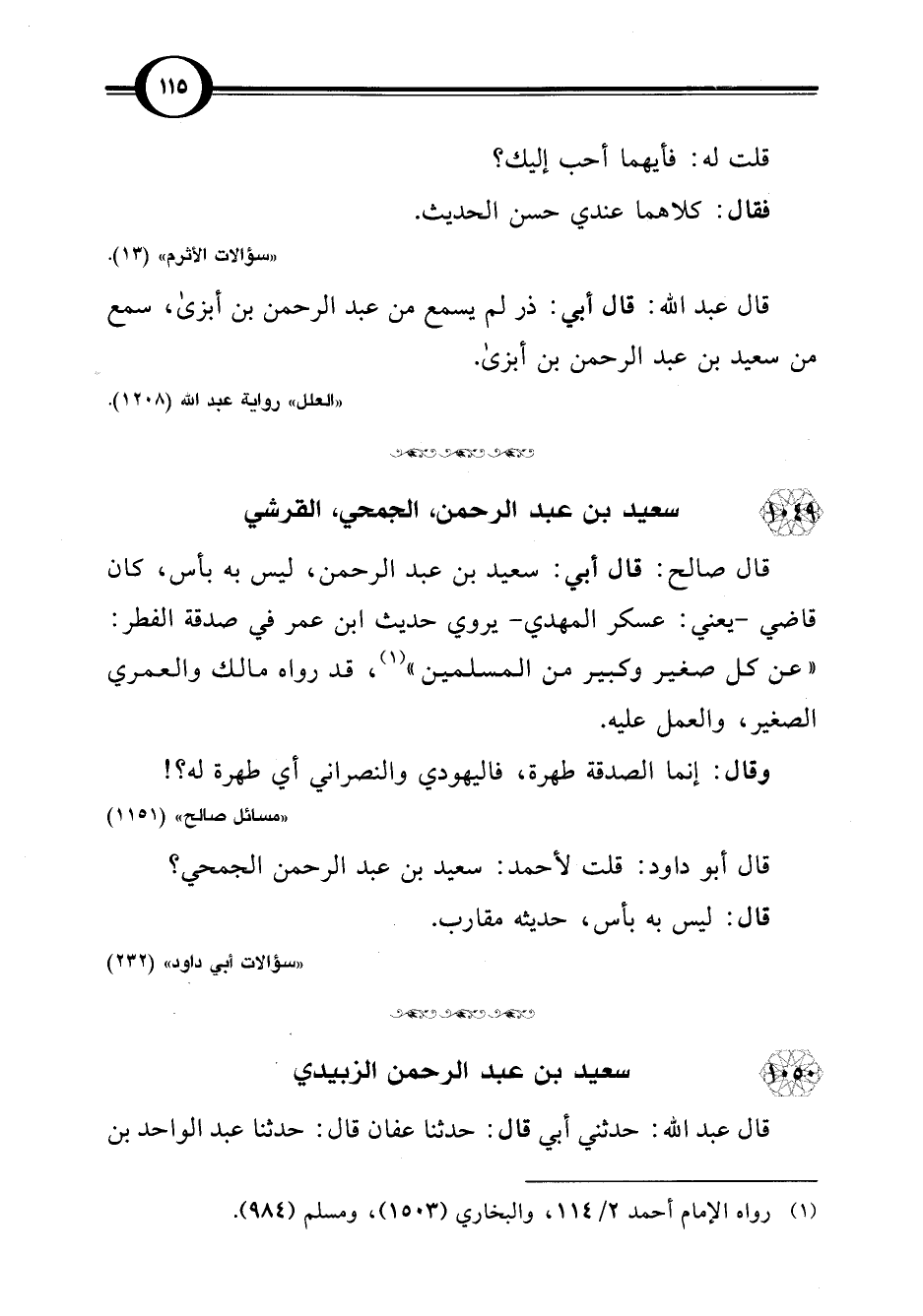 قال صالح: قال أبي: سعيد بن عبد الرحمن، ليس به بأس، كان قاضي -يعني: عسكر المهدي- يروي حديث ابن عمر في صدقة الفطر: "عن كل صغير وكبير من المسلمين" (¬1)، قد رواه مالك والعمري الصغير، والعمل عليه.