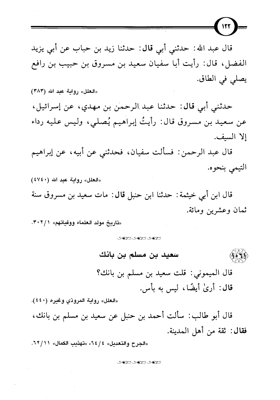قال عبد اللَّه: حدثني أبي قال: حدثنا زيد بن حباب عن أبي يزيد الفضل، قال: رأيت أبا سفيان سعيد بن مسروق بن حبيب بن رافع يصلي في الطاق.