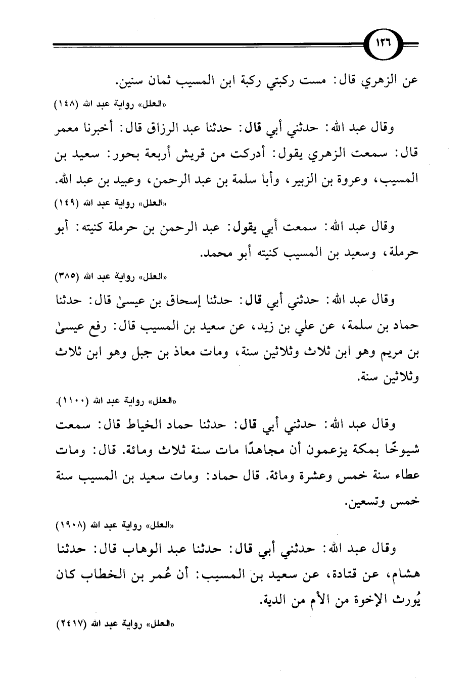 وقال عبد اللَّه: سمعت أبي يقول: عبد الرحمن بن حرملة كنيته: أبو حرملة، وسعيد بن المسيب كنيته أبو محمد.