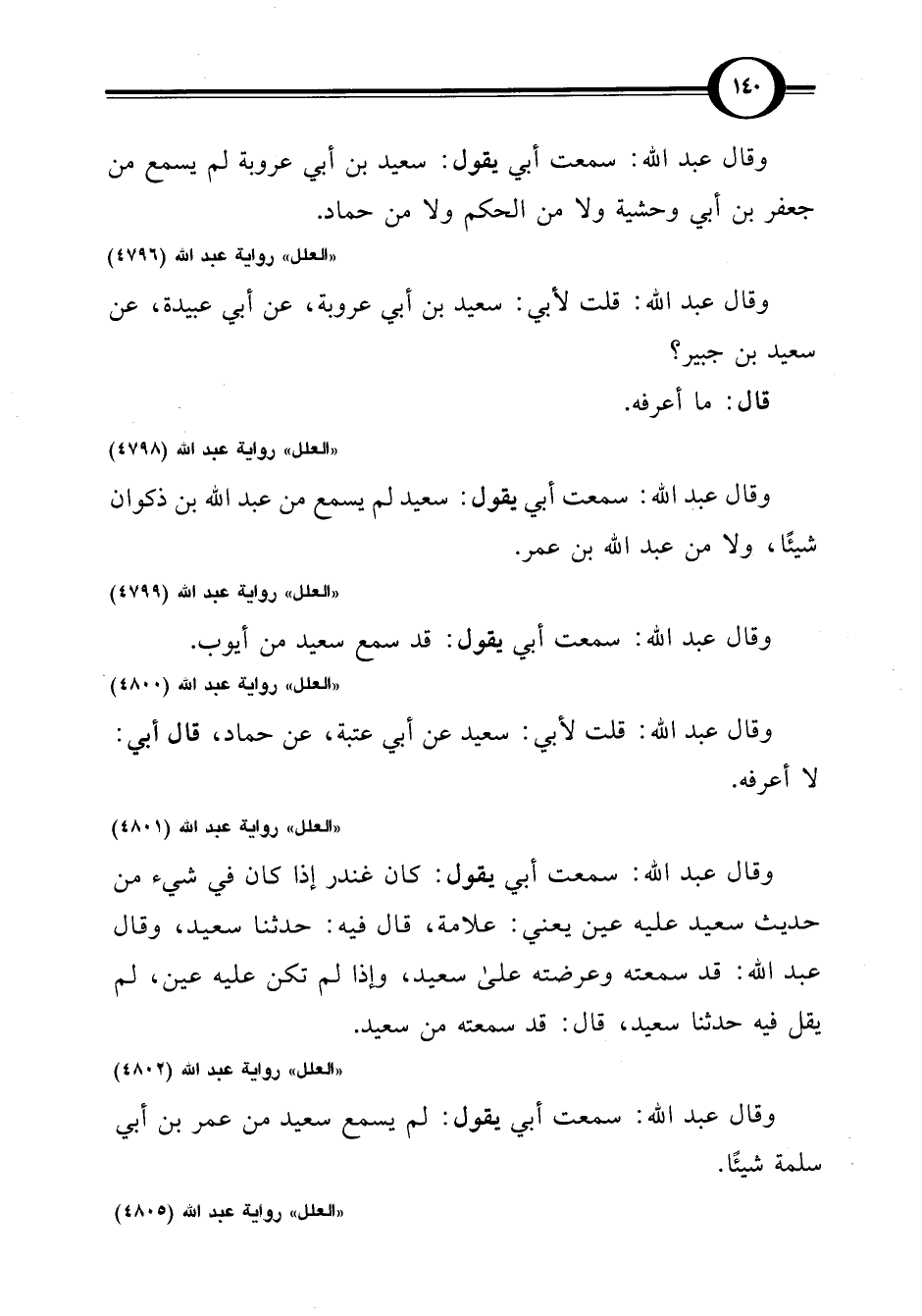 وقال عبد اللَّه: سمعت أبي يقول: كان غندر إذا كان في شيء من حديث سعيد عليه عين يعني: علامة، قال فيه: حدثنا سعيد، وقال عبد اللَّه: قد سمعته وعرضته على سعيد، وإذا لم تكن عليه عين، لم يقل فيه حدثنا سعيد، قال: قد سمعته من سعيد.