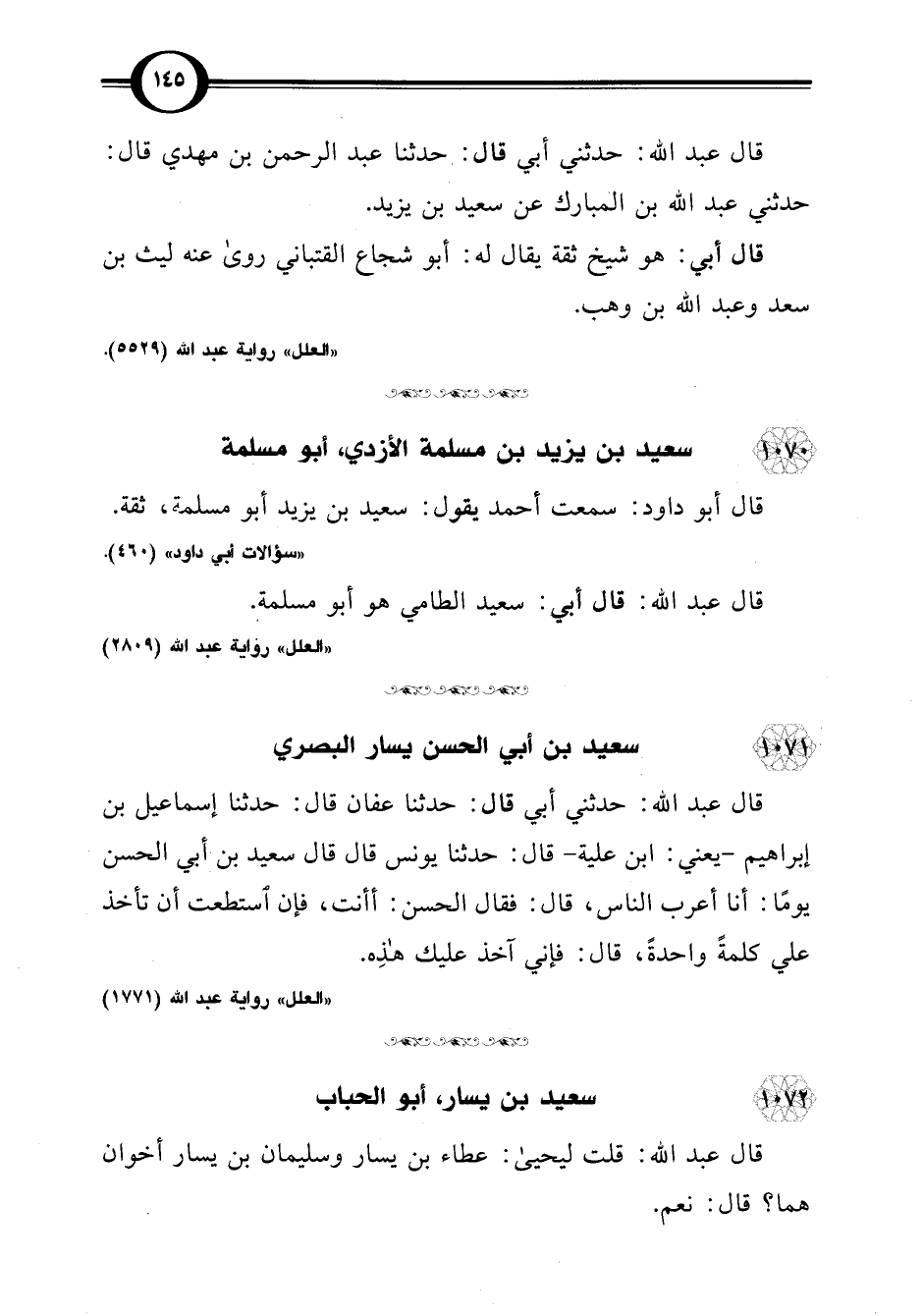 قال عبد اللَّه: حدثني أبي قال: حدثنا عبد الرحمن بن مهدي قال: حدثني عبد اللَّه بن المبارك عن سعيد بن يزيد.