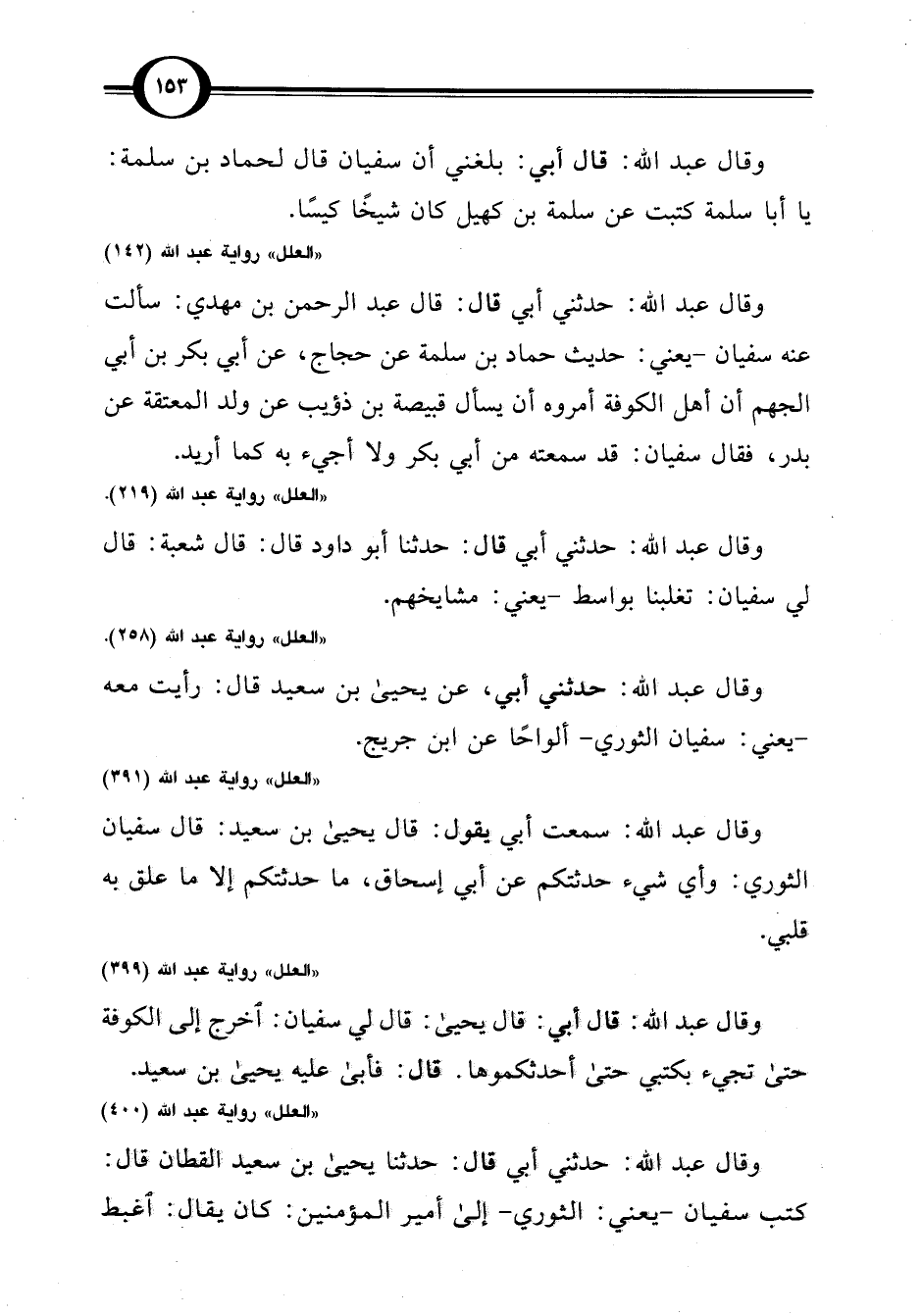 وقال عبد اللَّه: حدثني أبي قال: قال عبد الرحمن بن مهدي: سألت عنه سفيان -يعني: حديث حماد بن سلمة عن حجاج، عن أبي بكر بن أبي الجهم أن أهل الكوفة أمروه أن يسأل قبيصة بن ذؤدب عن ولد المعتقة عن بدر، فقال سفيان: قد سمعته من أبي بكر ولا أجيء به كما أريد.