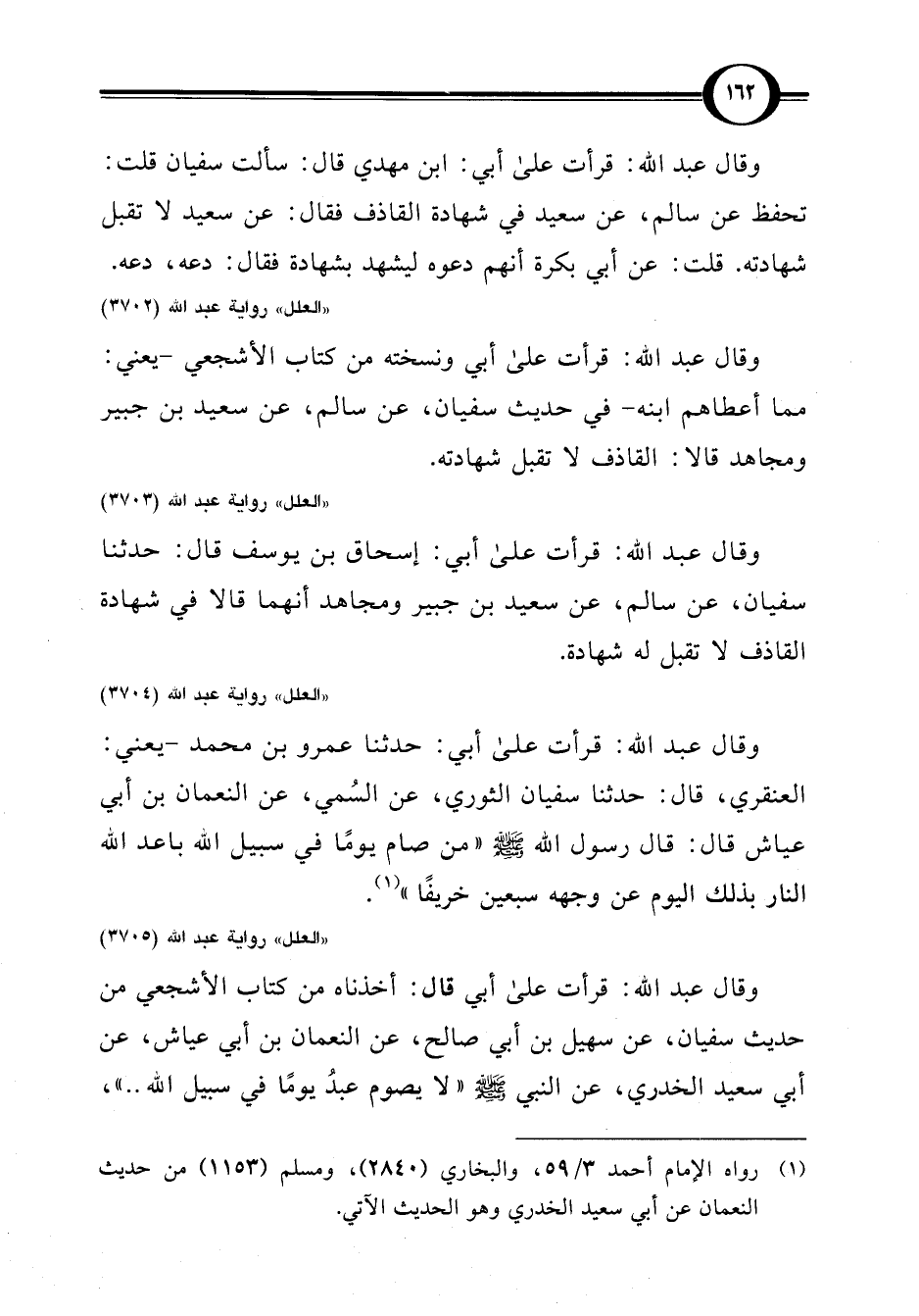 وقال عبد اللَّه: قرأت على أبي قال: أخذناه من كتاب الأشجعي من حديث سفيان، عن سهيل بن أبي صالح، عن النعمان بن أبي عياش، عن أبي سعيد الخدري، عن النبي -صلى اللَّه عليه وسلم- "لا يصوم عبدُ يومًا في سبيل اللَّه. . "،