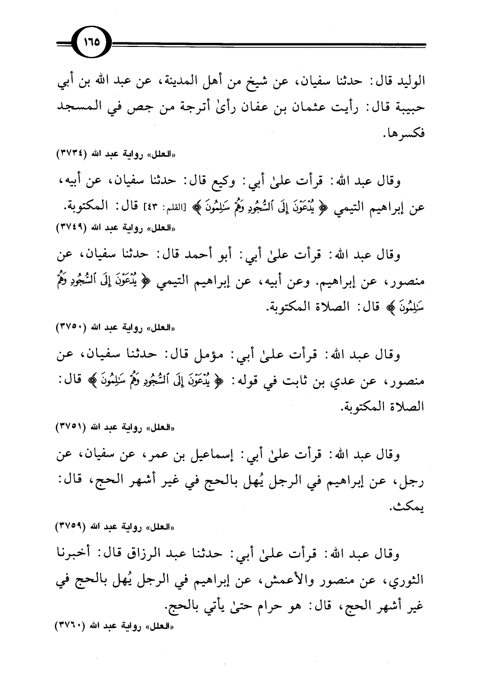 وقال عبد اللَّه: قرأت على أبي: وكيع قال: حدثنا سفيان، عن أبيه، عن إبراهيم التيمي {يُدْعَوْنَ إِلَى السُّجُودِ وَهُمْ سَالِمُونَ} [القلم: 43] قال: المكتوبة.