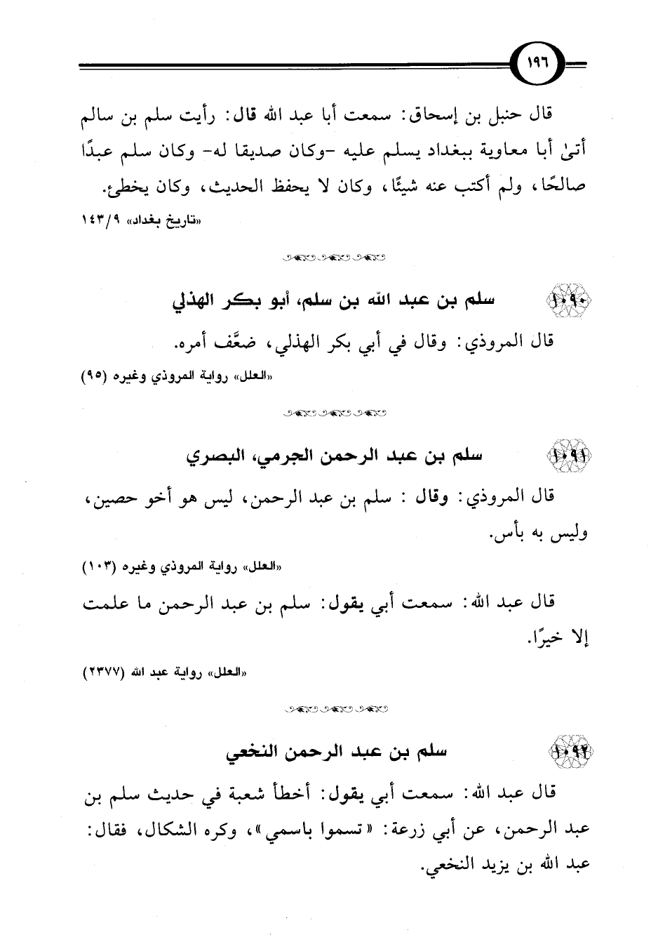قال حنبل بن إسحاق: سمعت أبا عبد اللَّه قال: رأيت سلم بن سالم أتى أبا معاوية ببغداد يسلم عليه -وكان صديقا له- وكان سلم عبدًا صالحًا، ولم أكتب عنه شيئًا، وكان لا يحفظ الحديث، وكان يخطئ.