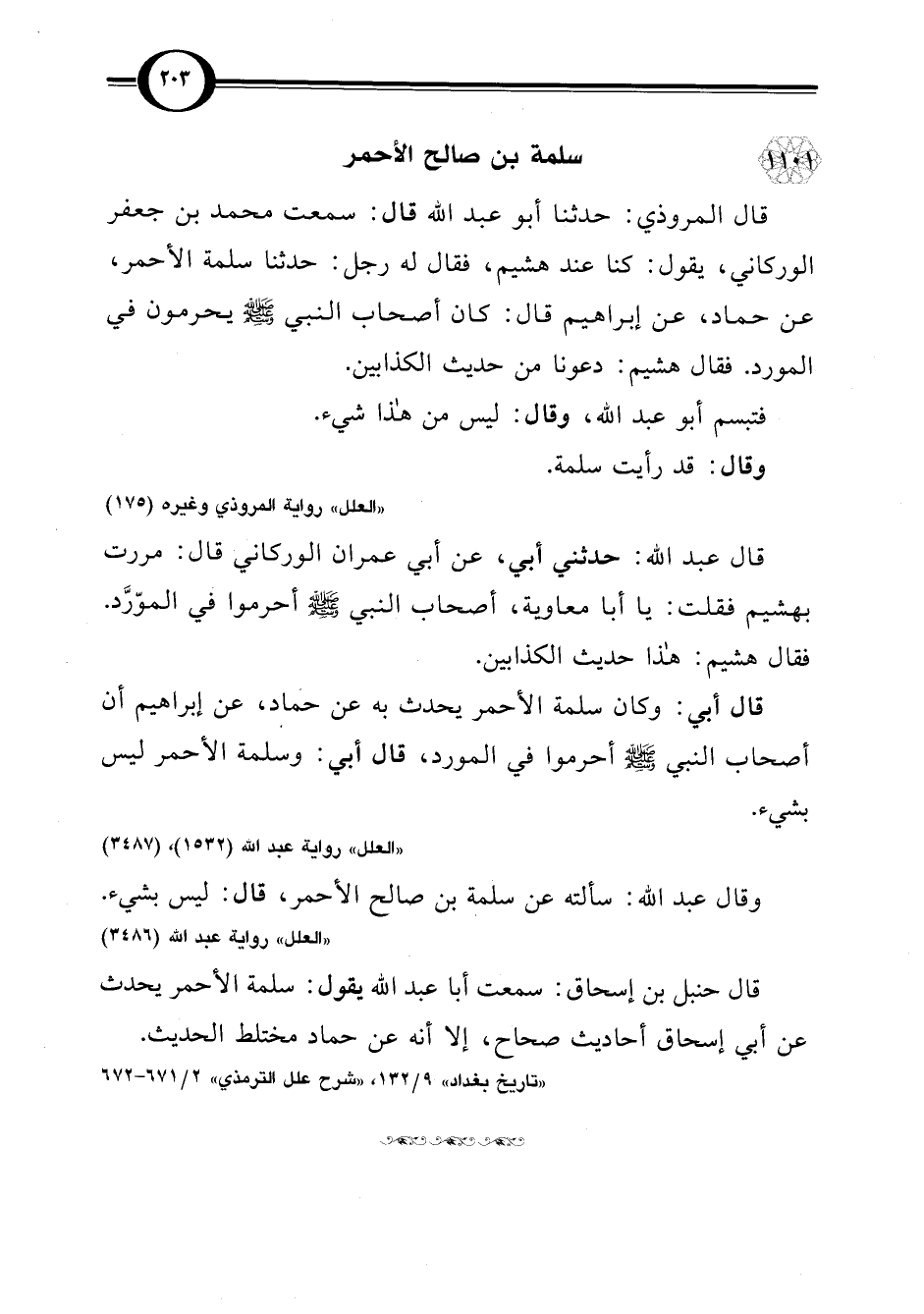 قال عبد اللَّه: حدثني أبي، عن أبي عمران الوركاني قال: مررت بهشيم فقلت: يا أبا معاوية، أصحاب النبي -صلى اللَّه عليه وسلم- أحرموا في الموّرَّد. فقال هشيم: هذا حديث الكذابين.