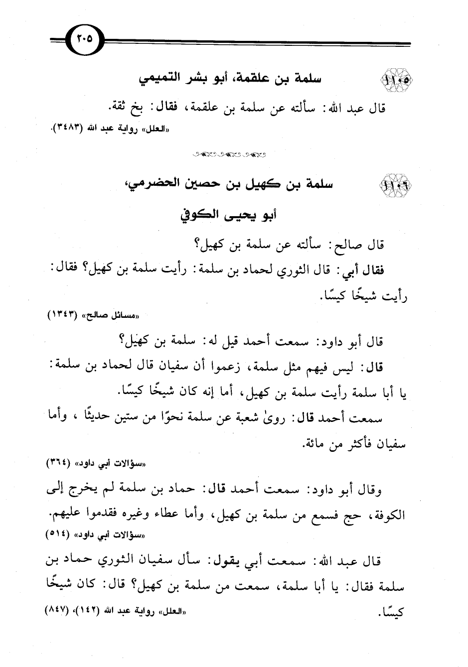 قال عبد اللَّه: سمعت أبي يقول: سأل سفيان الثوري حماد بن سلمة فقال: يا أبا سلمة، سمعت من سلمة بن كهيل؟ قال: كان شيخًا كيسًا.