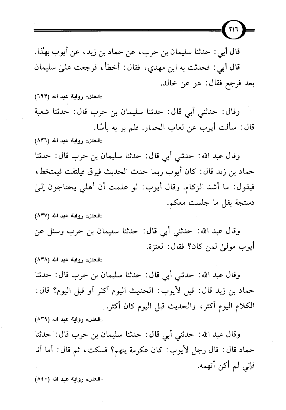 وقال عبد اللَّه: حدثني أبي قال: حدثنا سليمان بن حرب قال: حدثنا حماد بن زيد قال: قيل لأيوب: الحديث اليوم أكثر أو قبل اليوم؟ قال: الكلام اليوم أكثر، والحديث قبل اليوم كان أكثر.