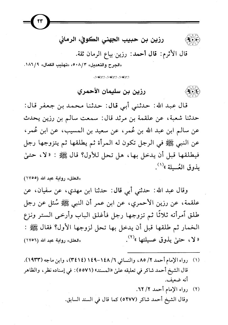 وقال عبد اللَّه: حدثني أبي قال: حدثنا ابن مهدي، عن سفيان، عن علقمة، عن رزين الأحمري، عن ابن عمر أن النبي -صلى اللَّه عليه وسلم- سُئل عن رجل طلق امرأته ثلاثًا ثم تزوجها رجل فأغلق الباب وأرخى الستر ونزع الخمار ثم طلقها قبل أن يدخل بها تحل لزوجها الأول؟ فقال -صلى اللَّه عليه وسلم-: "لا، حتى يذوق عسيلتها" (¬2).