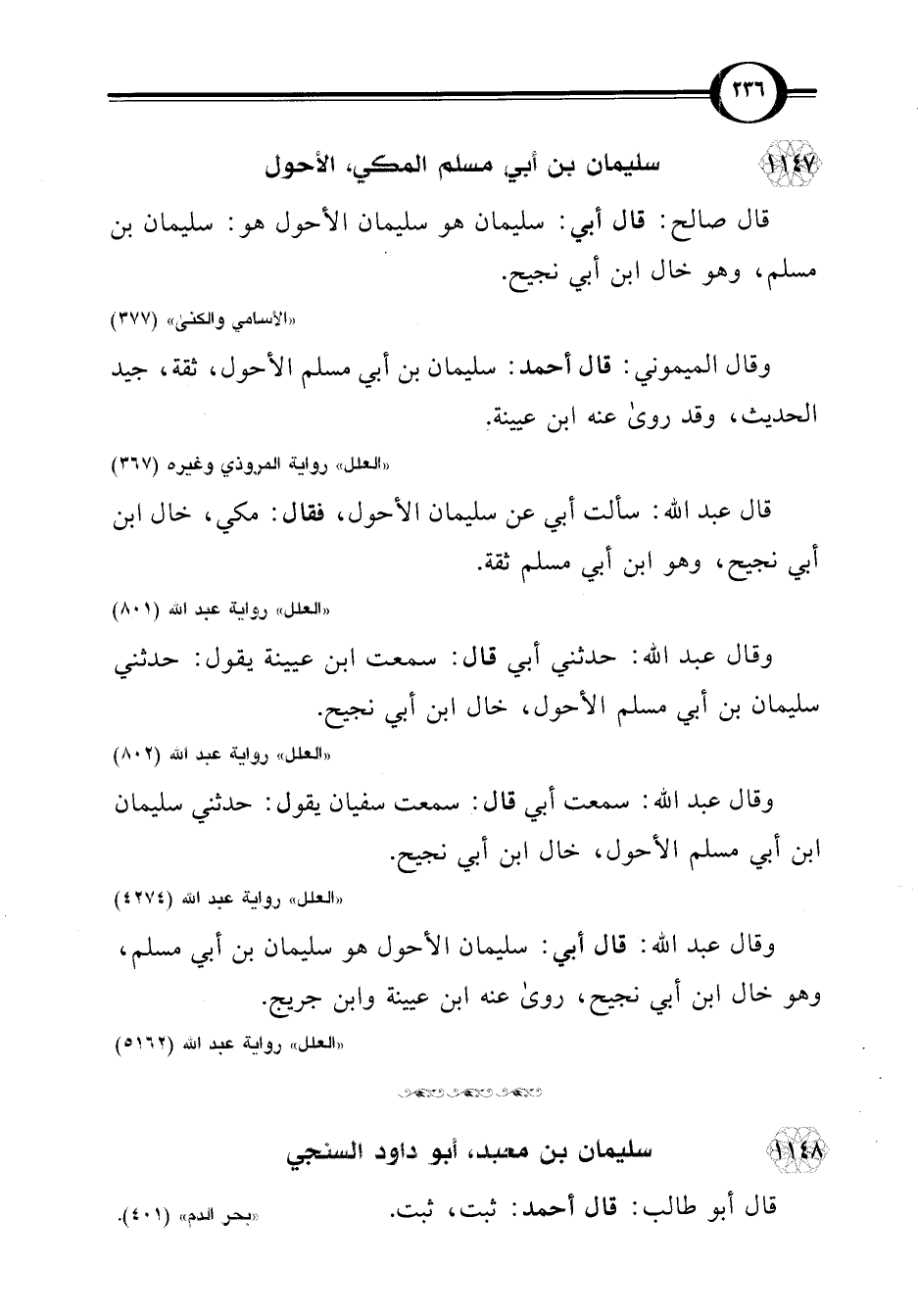 وقال عبد اللَّه: قال أبي: سليمان الأحول هو سليمان بن أبي مسلم، وهو خال ابن أبي نجيح، روى عنه ابن عيينة وابن جريج.