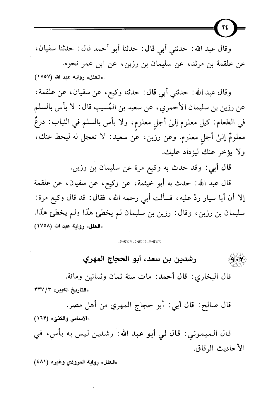 وقال عبد اللَّه: حدثني أبي قال: حدثنا وكيع، عن سفيان، عن علقمة، عن رزين بن سليمان الأحمري، عن سعيد بن المُسيب قال: لا بأس بالسلم في الطعام: كيل معلوم إلى أجلٍ معلومٍ، ولا بأس بالسلم في الثياب: ذرعٌ معلومٌ إلى أجلٍ معلوم. وعن رزين، عن سعيد: لا تعجل له ليحط عنك، ولا يؤخر عنك ليزداد عليك.