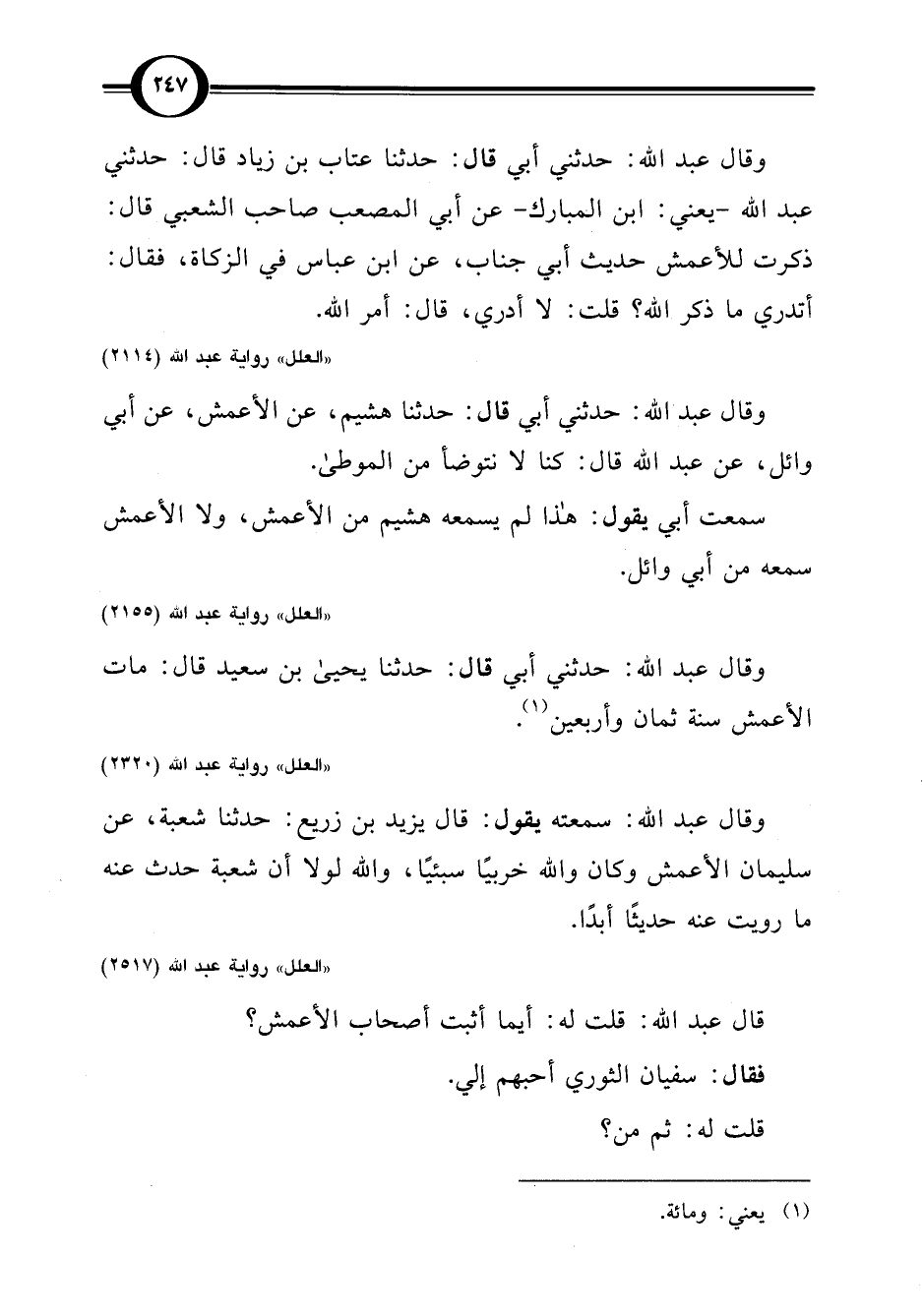 وقال عبد اللَّه: حدثني أبي قال: حدثنا يحيى بن سعيد قال: مات الأعمش سنة ثمان وأربعين (¬1).