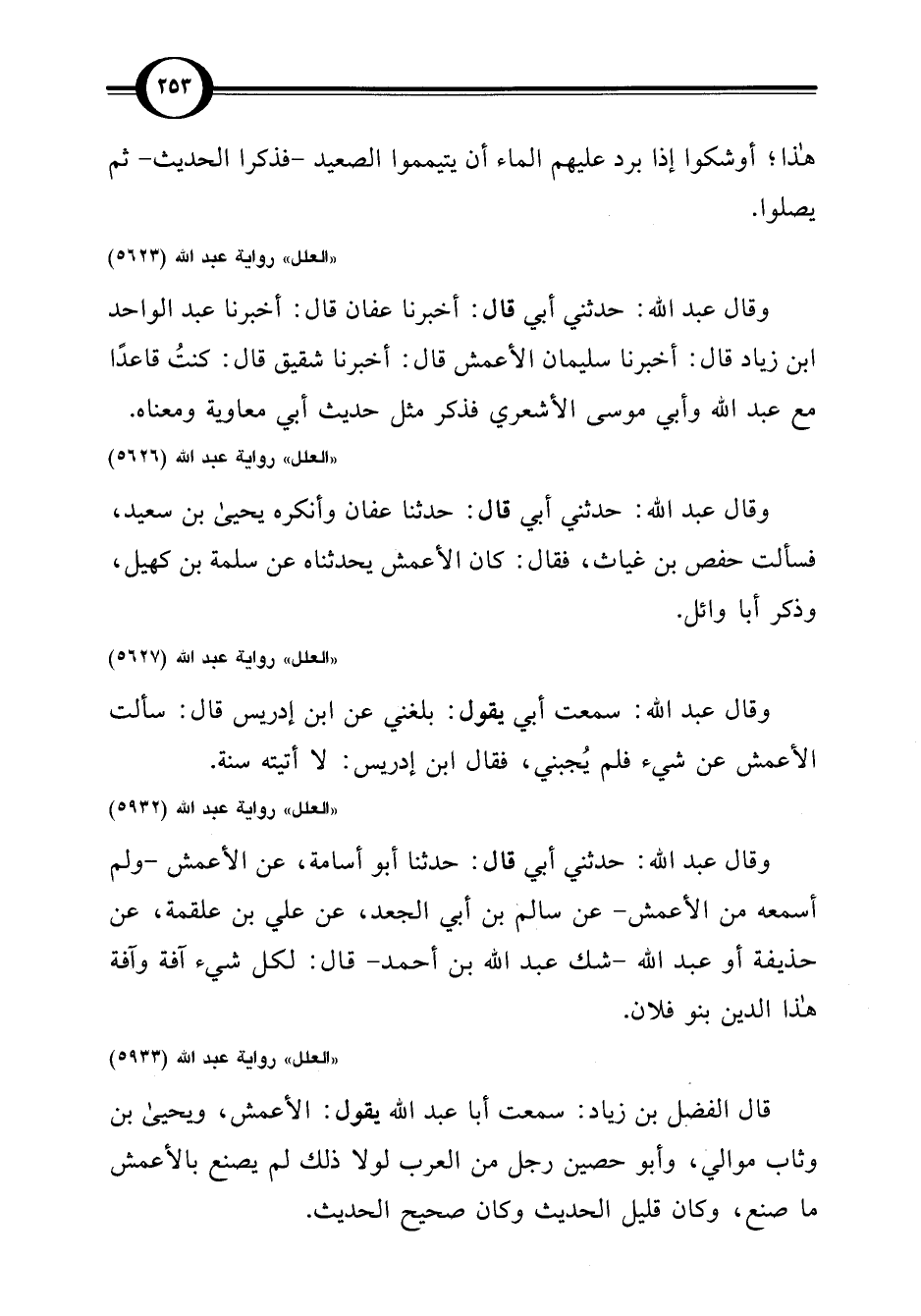 وقال عبد اللَّه: حدثني أبي قال: حدثنا عفان وأنكره يحيى بن سعيد، فسألت حفص بن غياث، فقال: كان الأعمش يحدثناه عن سلمة بن كهيل، وذكر أبا وائل.