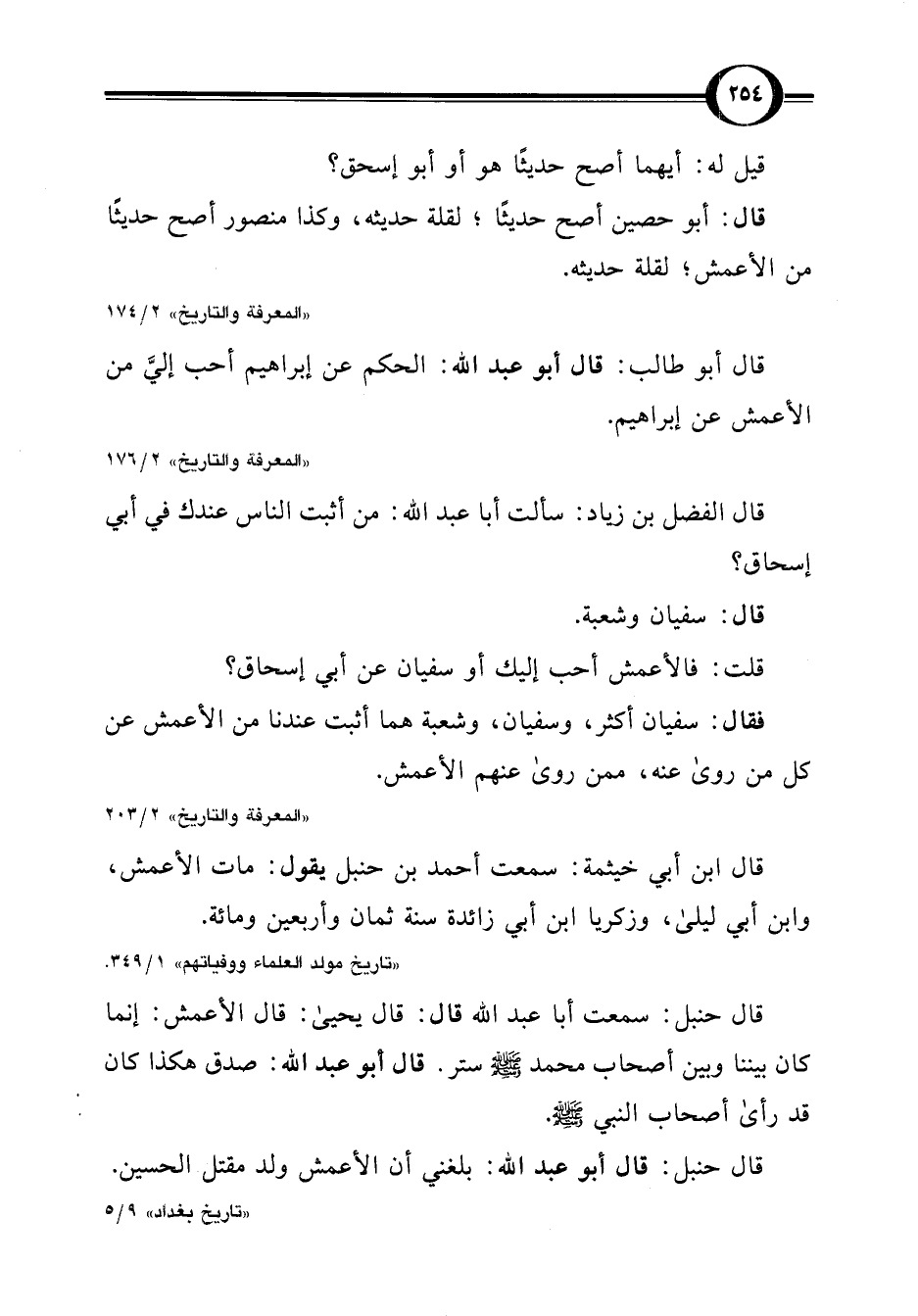 قال حنبل: سمعت أبا عبد اللَّه قال: قال يحيى: قال الأعمش: إنما كان بيننا وبين أصحاب محمد -صلى اللَّه عليه وسلم- ستر. قال أبو عبد اللَّه: صدق هكذا كان قد رأى أصحاب النبي -صلى اللَّه عليه وسلم-.