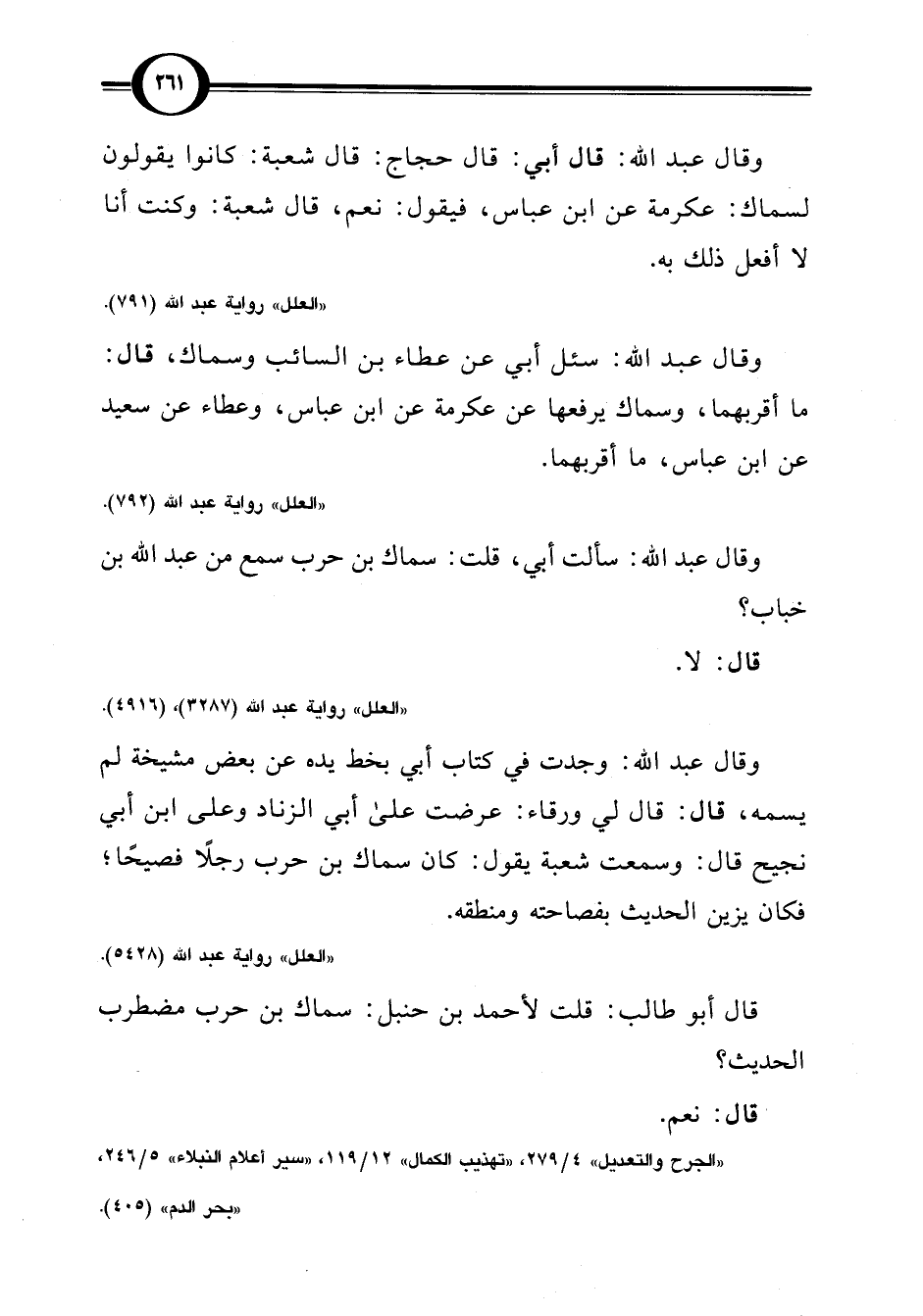 وقال عبد اللَّه: قال أبي: قال حجاج: قال شعبة: كانوا يقولون لسماك: عكرمة عن ابن عباس، فيقول: نعم، قال شعبة: وكنت أنا لا أفعل ذلك به.