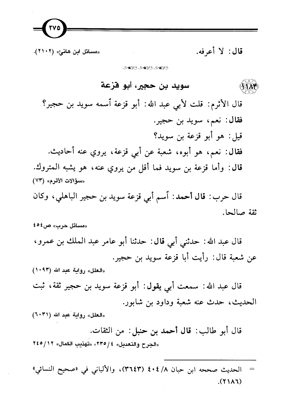 قال عبد اللَّه: حدثني أبي قال: حدثنا أبو عامر عبد الملك بن عمرو، عن شعبة قال: رأيت أبا قزعة سويد بن حجير.