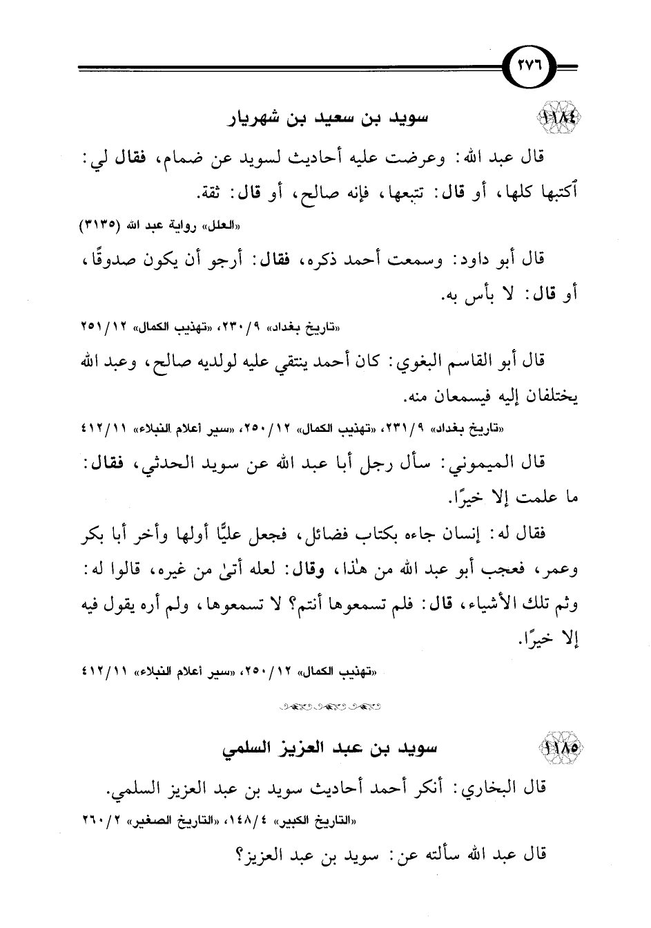 قال عبد اللَّه: وعرضت عليه أحاديث لسويد عن ضمام، فقال لي: اكتبها كلها، أو قال: تتبعها، فإنه صالح، أو قال: ثقة.