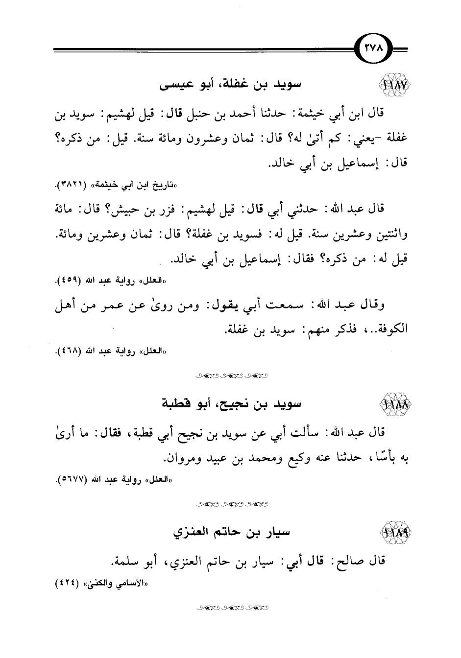 قال عبد اللَّه: حدثني أبي قال: قيل لهشيم: فزر بن حبيش؟ قال: مائة واثنتين وعشرين سنة. قيل له: فسويد بن غفلة؟ قال: ثمان وعشرين ومائة. قيل له: من ذكره؟ فقال: إسماعيل بن أبي خالد.