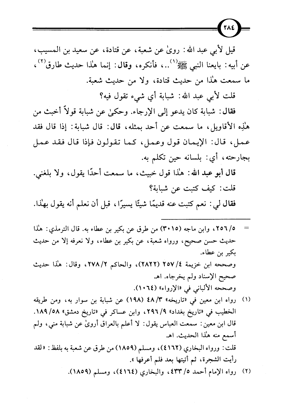 قيل لأبي عبد اللَّه: روى عن شعبة، عن قتادة، عن سعيد بن المسيب، عن أبيه: بايعنا النبي -صلى اللَّه عليه وسلم- (¬1). .، فأنكره، وقال: إنما هذا حديث طارق (¬2)، ما سمعت هذا من حديث قتادة، ولا من حديث شعبة.