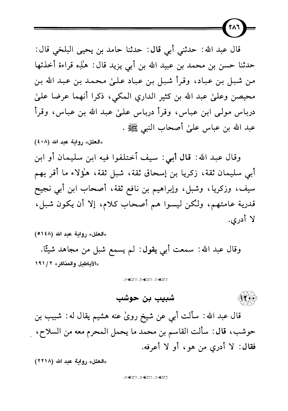 قال عبد اللَّه: سألت أبي عن شيخ روى عنه هشيم يقال له: شبيب بن حوشب، قال: سألت القاسم بن محمد ما يحمل المحرم معه من السلاح، فقال: لا أدري من هو، أو لا أعرفه.