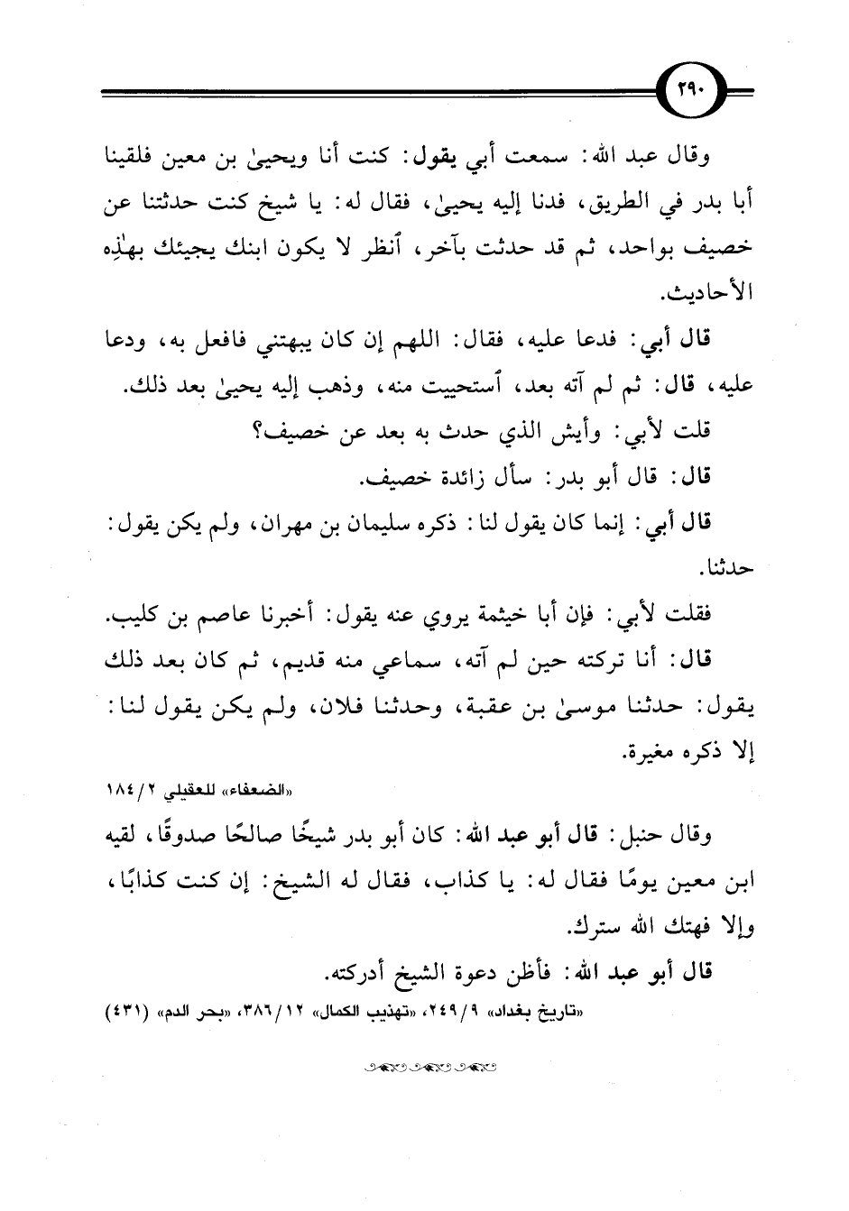 "تاريخ بغداد" 9/ 249، "تهذيب الكمال" 12/ 386، "بحر الدم" (431)