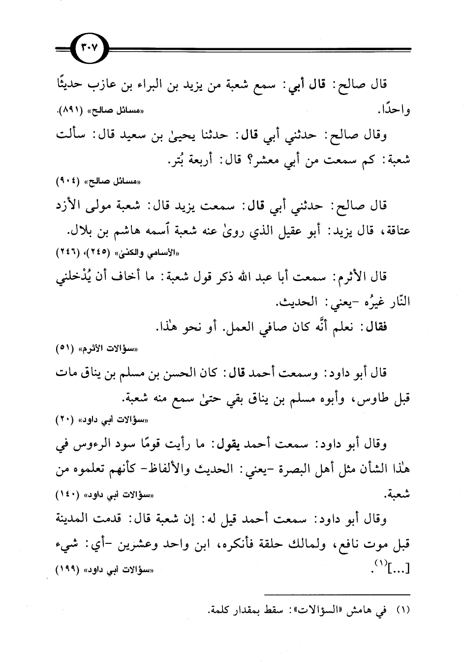 وقال أبو داود: سمعت أحمد قيل له: إن شعبة قال: قدمت المدينة قبل موت نافع، ولمالك حلقة فأنكره، ابن واحد وعشرين -أي: شيء [. . .] (¬1).