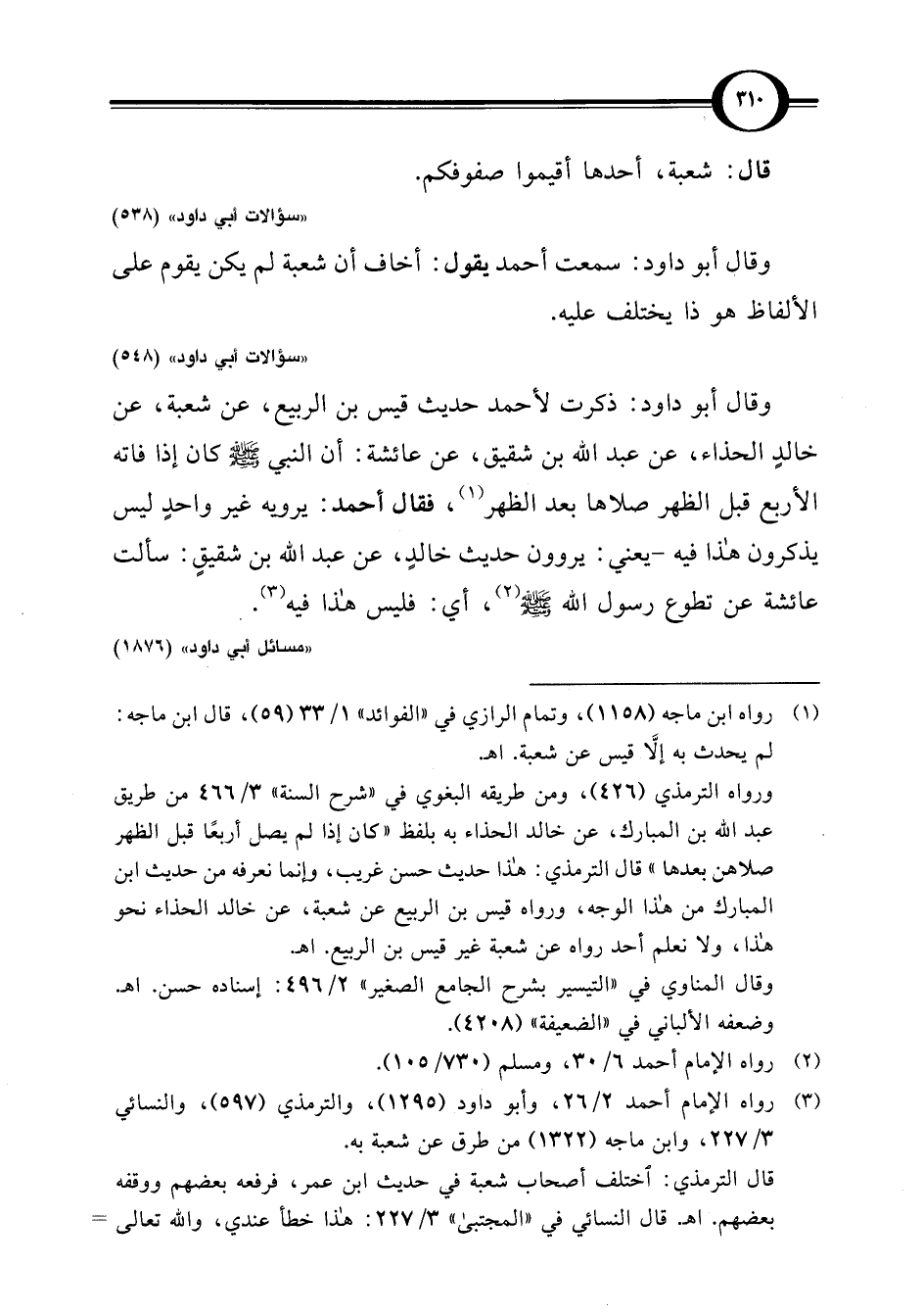 وقال أبو داود: ذكرت لأحمد حديث قيس بن الربيع، عن شعبة، عن خالدٍ الحذاء، عن عبد اللَّه بن شقيق، عن عائشة: أن النبي -صلى اللَّه عليه وسلم- كان إذا فاته الأربع قبل الظهر صلاها بعد الظهر (¬1)، فقال أحمد: يرويه غير واحدٍ ليس يذكرون هذا فيه -يعني: يروون حديث خالدٍ، عن عبد اللَّه بن شقيقٍ: سألت عائشة عن تطوع رسول اللَّه -صلى اللَّه عليه وسلم- (¬2)، أي: فليس هذا فيه (¬3).
