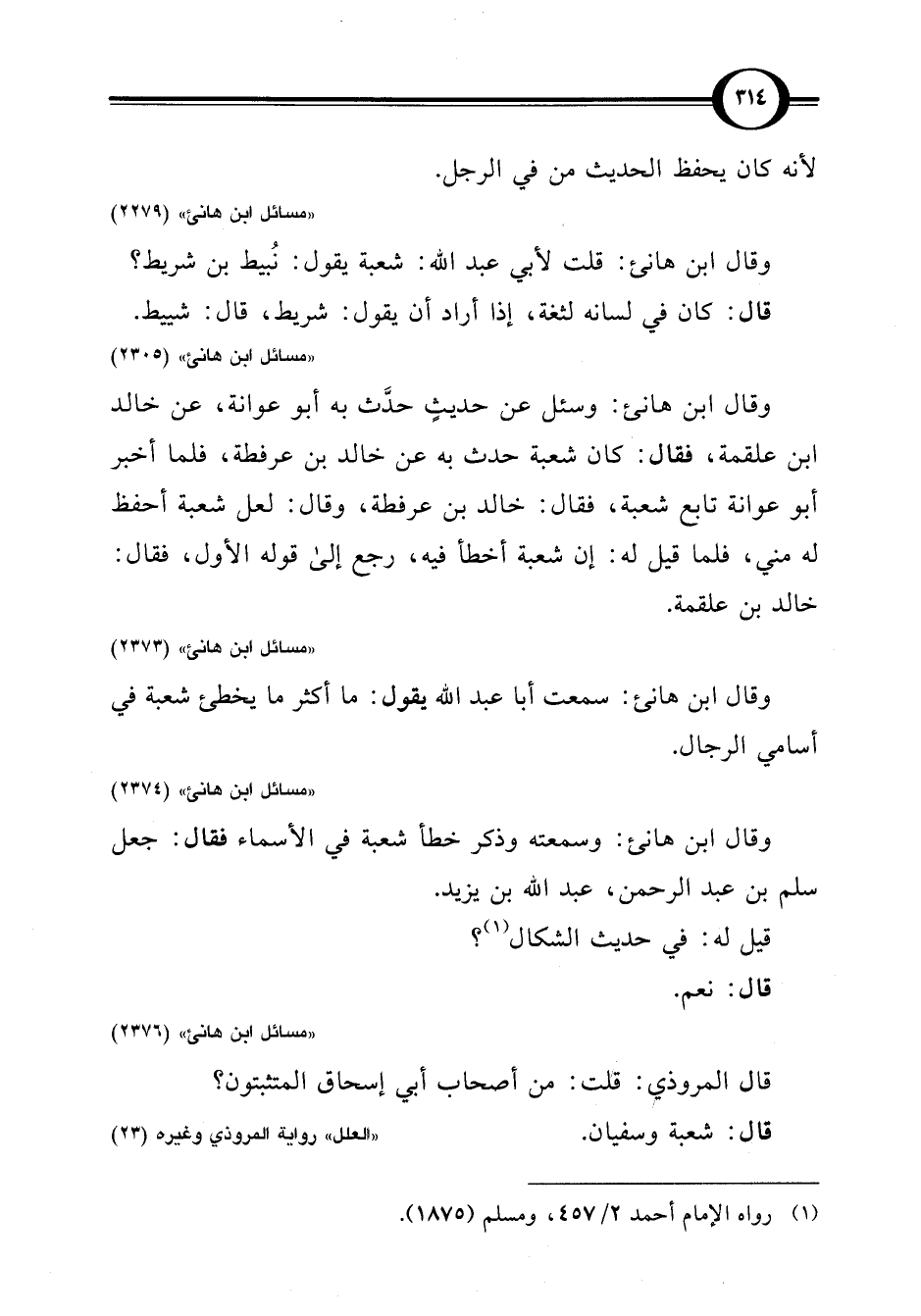 وقال ابن هانئ: وسئل عن حديثٍ حدَّث به أبو عوانة، عن خالد ابن علقمة، فقال: كان شعبة حدث به عن خالد بن عرفطة، فلما أخبر أبو عوانة تابع شعبة، فقال: خالد بن عرفطة، وقال: لعل شعبة أحفظ له مني، فلما قيل له: إن شعبة أخطأ فيه، رجع إلى قوله الأول، فقال: خالد بن علقمة.