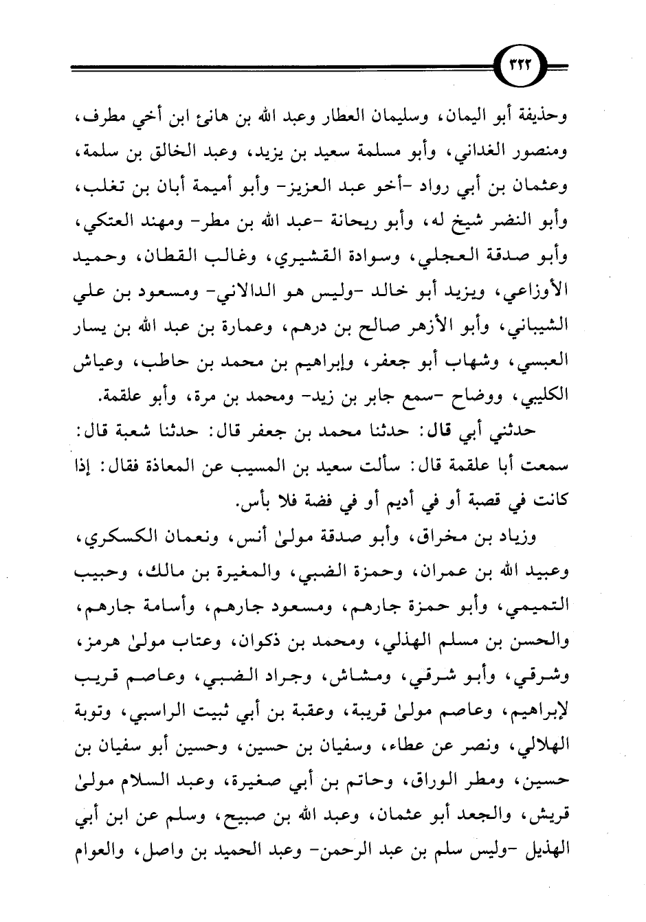 وزياد بن مخراق، وأبو صدقة مولى أنس، ونعمان الكسكري، وعبيد اللَّه بن عمران، وحمزة الضبي، والمغيرة بن مالك، وحبيب التميمي، وأبو حمزة جارهم، ومسعود جارهم، وأسامة جارهم، والحسن بن مسلم الهذلي، ومحمد بن ذكوان، وعتاب مولى هرمز، وشرقي، وأبو شرقي، ومشاش، وجراد الضبي، وعاصم قريب لإبراهيم، وعاصم مولى قريبة، وعقبة بن أبي ثبيت الراسبي، وتوبة الهلالي، ونصر عن عطاء، وسفيان بن حسين، وحسين أبو سفيان بن حسين، ومطر الوراق، وحاتم بن أبي صغيرة، وعبد السلام مولى قريش، والجعد أبو عثمان، وعبد اللَّه بن صبيح، وسلم عن ابن أبي الهذيل -وليس سلم بن عبد الرحمن- وعبد الحميد بن واصل، والعوام
